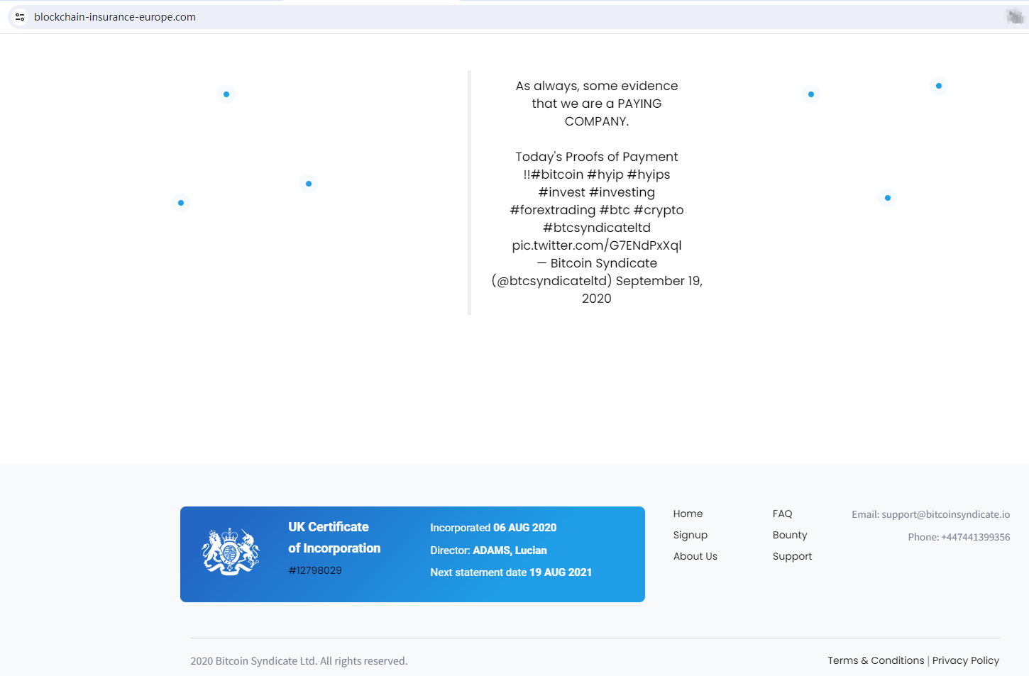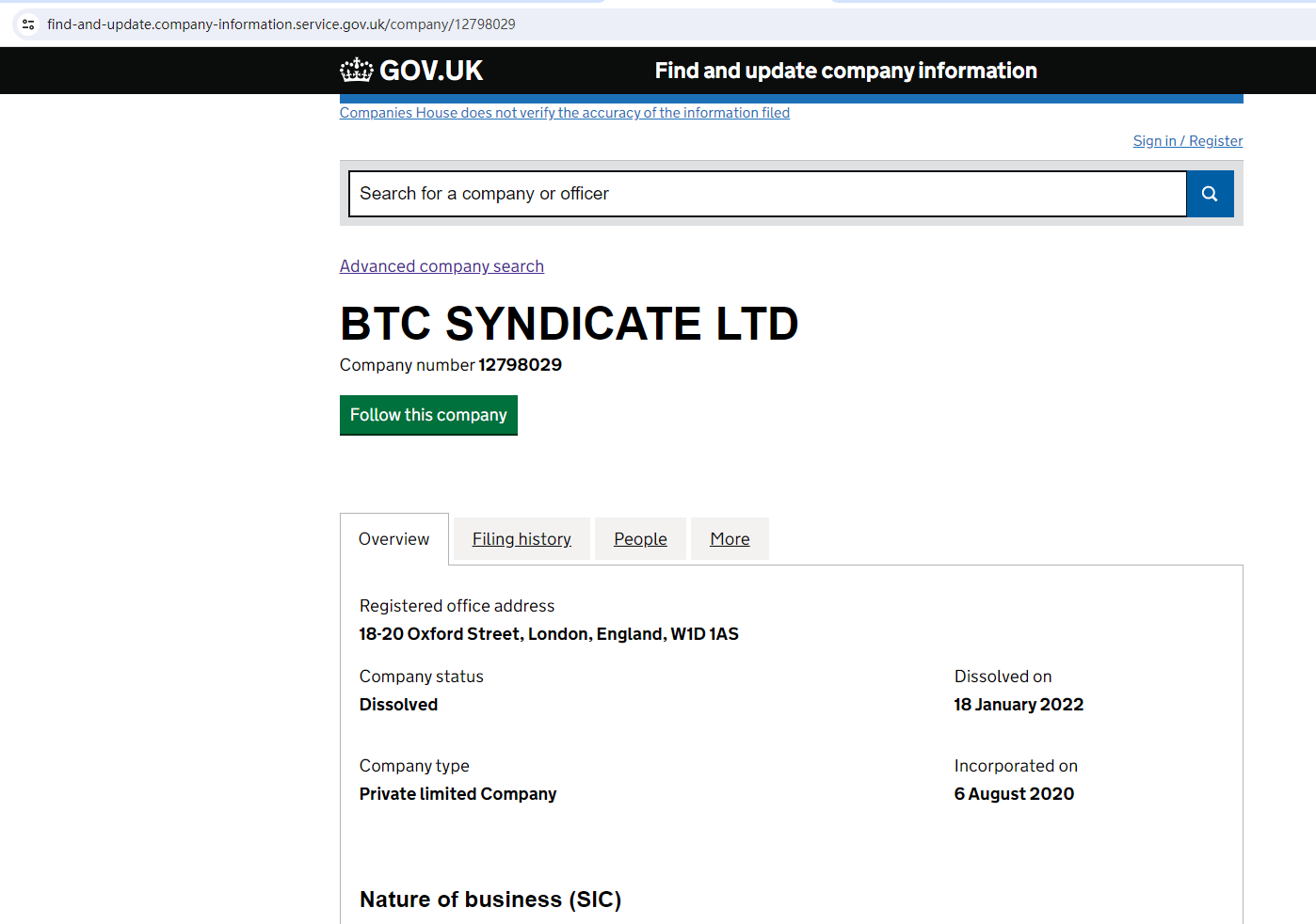 BITCOIN SYNDICATE claims to be registered under the UK Companies House (CH). While we searched for it and indeed found corresponding entires in the CH registry, but it was dissolved.