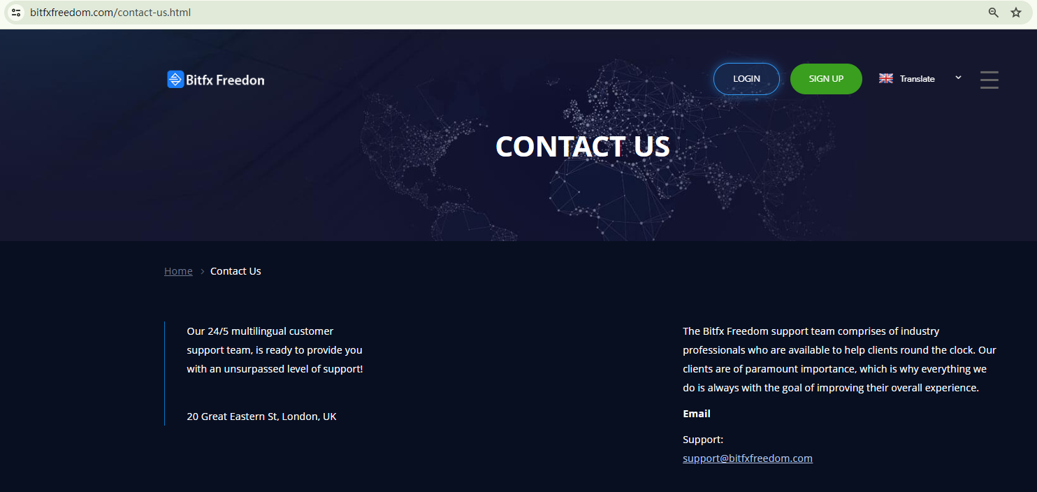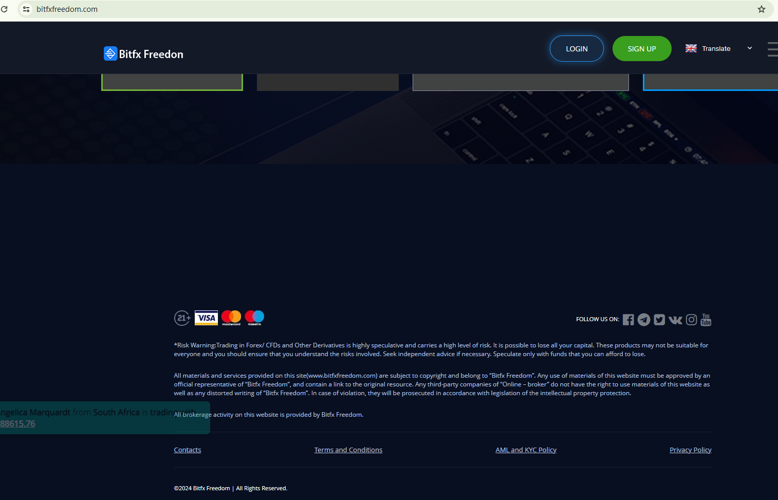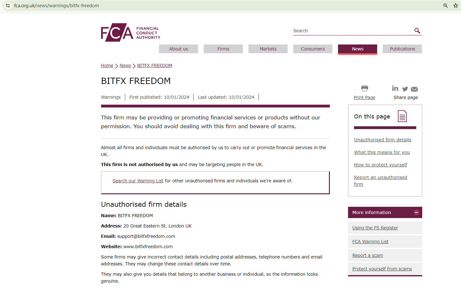 While BITFX FREEDOM claims to be regulated forex broker, it doesn't provide any specific information regarding its regulatory status. This lack of licensing data is a significant scam indicator.Despite the claims of having an office in the UK, it fails to adhere to the British laws and hasn't obtained a license from the Financial Conduct Authority (FCA). This non-compliance has resulted in a warning from the FCA.In essence, BITFX FREEDOM is not regulated by any governing body. Entrusting this broker with investors' funds is highly risky, as there are no legal protections in place to safeguard the funds.BITFX FREEDOM appears to be a scam.