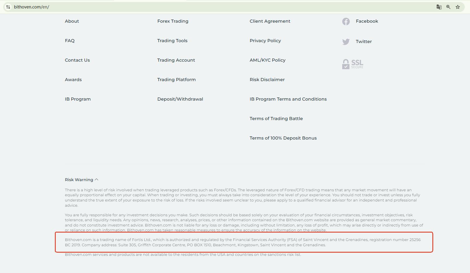 Bithoven only claims to be registered in Saint Vincent and the Grenadines on its website. While we can find a matching company in the Financial Services Authority (FSA) registry of Saint Vincent and the Grenadines, this only grants International Business Company (IBC) status. This does not constitute a valid financial licence. The SVG FSA has clearly stated that it does not regulate or licence forex brokers. Furthermore, its registration status in Saint Vincent is now shown as "cancelled," indicating that the entity may have underlying operational issues.