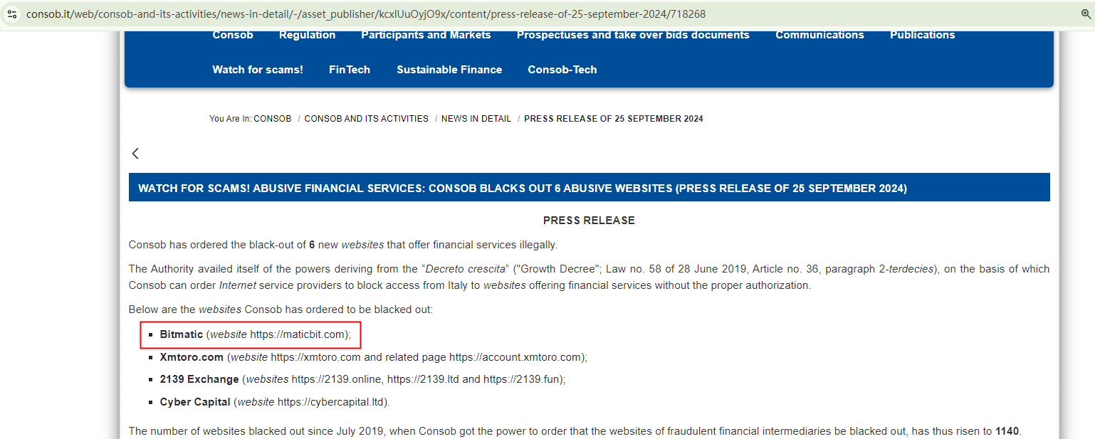 In addition, the website of Bitmatic has been blacklisted by the Italian Companies and Exchange Commission (CONSOB) for operating in Italy illegally.