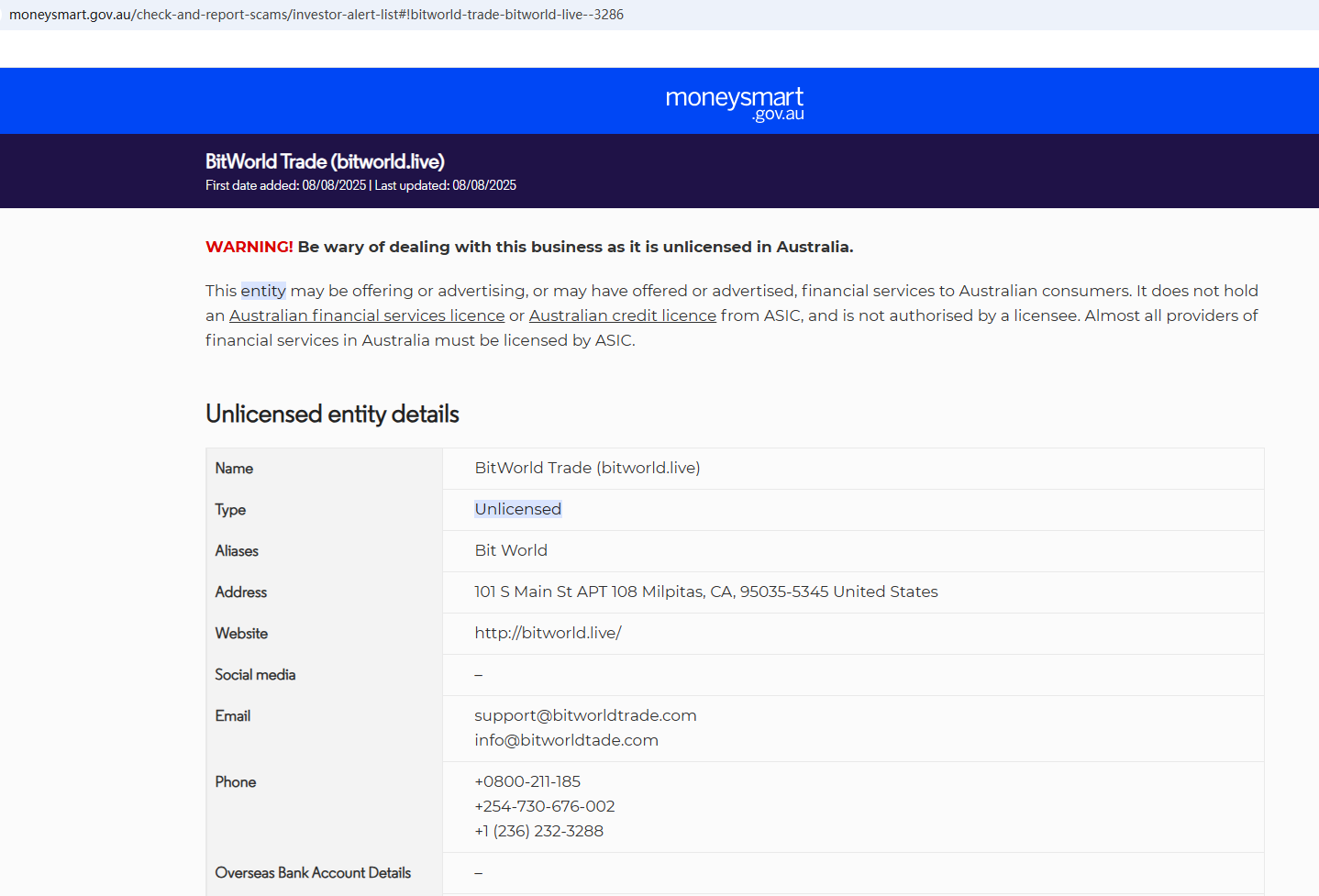 On Aug 8, 2025, the Australian Securities & Investments Commission (ASIC) issued a warning against BitWorld Trade, believing this company might be providing financial services or products without proper authorization. https://moneysmart.gov.au/check-and-report-scams/investor-alert-list#!bitworld-trade-bitworld-live--3286