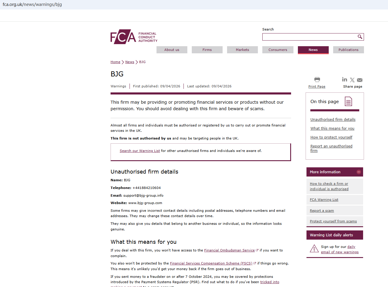 On April 9, 2026, the Financial Conduct Authority (FCA) issued a warning regarding BJG, suspecting that this company may be offering financial services or products without the necessary authorization. https://www.fca.org.uk/news/warnings/bjg