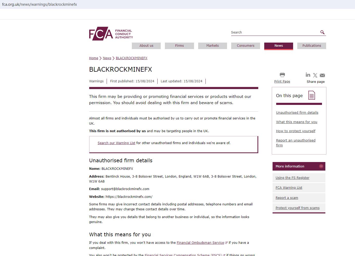 According to its website, it is located in the UK. Upon ivvestigation, we found that the Financial Conduct Authority (FCA) issued a warning against BLACKROCKMINEFX believing this company might be providing financial services or products without proper authorization in the UK.