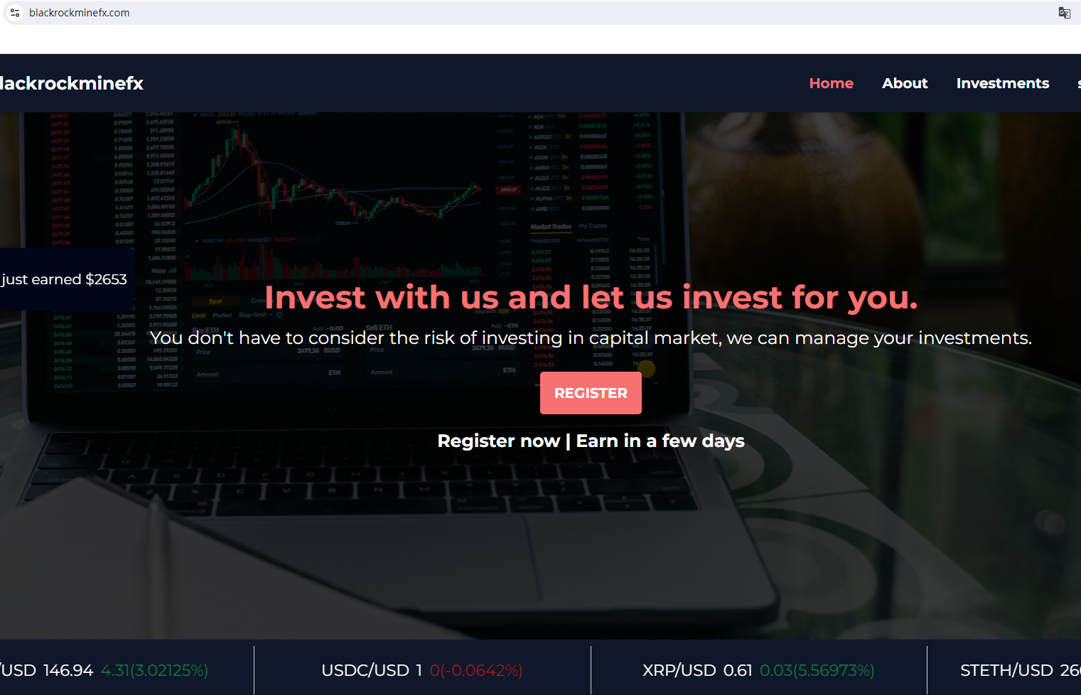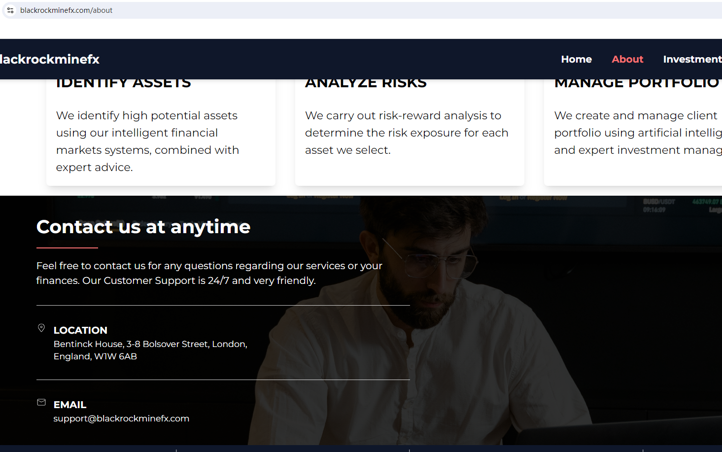 According to its website, it is located in the UK. Upon ivvestigation, we found that the Financial Conduct Authority (FCA) issued a warning against BLACKROCKMINEFX believing this company might be providing financial services or products without proper authorization in the UK.In essence, BLACKROCKMINEFX is not regulated by any governing body. Entrusting it with investors' funds is highly risky, as there are no legal protections in place to safeguard the funds.BLACKROCKMINEFX appears to be a scam.