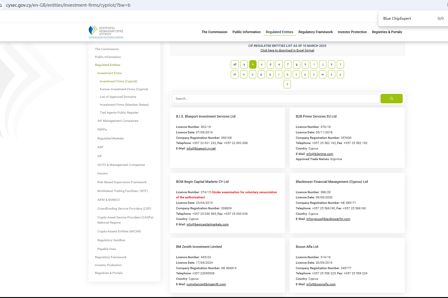 According to its website, it is regulated by both the Financial Conduct Authority (FCA) and the Cyprus Securities and Exchange Commission (CySEC). However, a search revealed no matching information with CySEC. Furthermore, the FCA issued a warning regarding Blue-ChipExpert, suspecting that this company may be offering financial services or products without the necessary authorization.