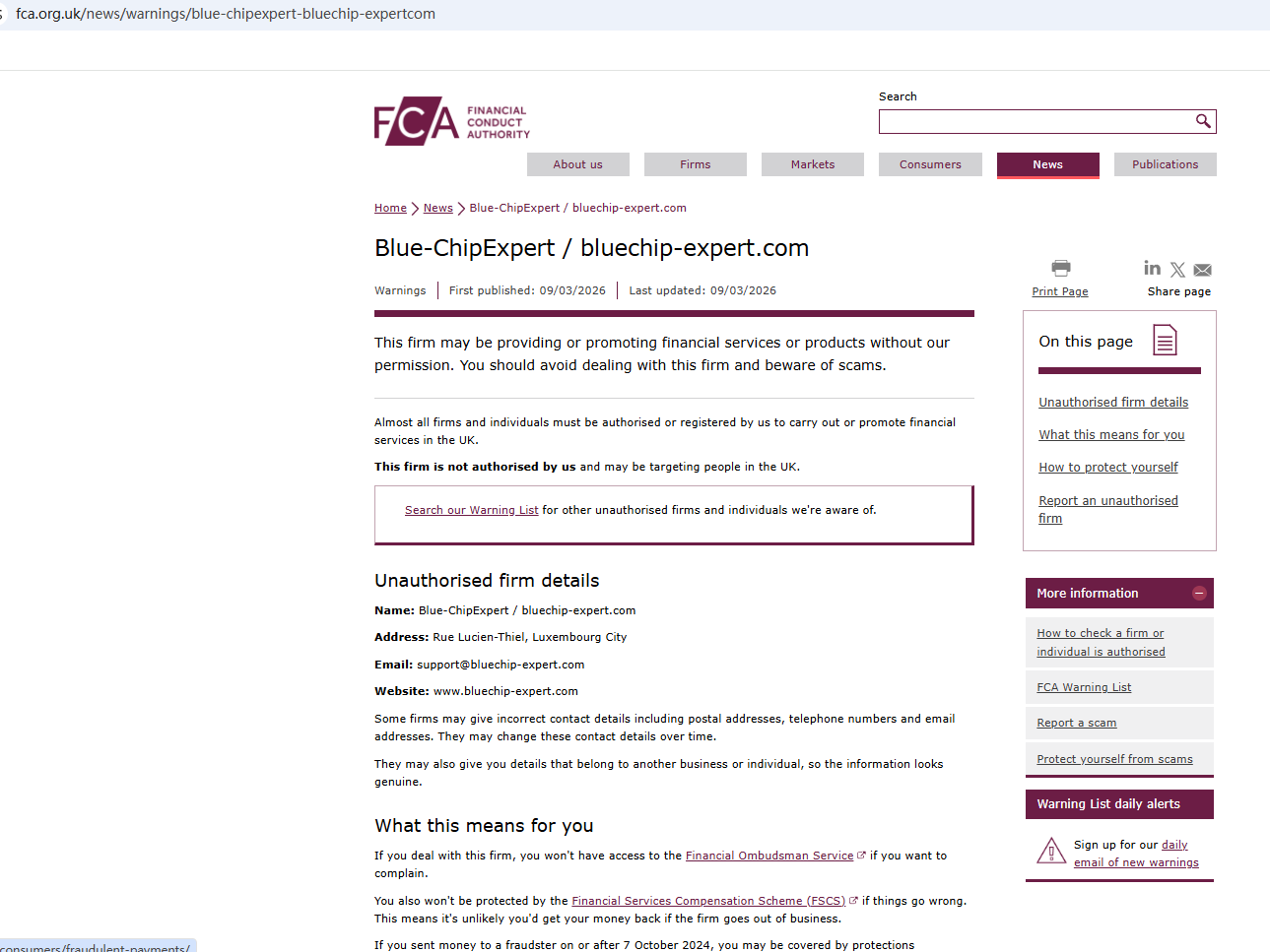 On Mar 9, 2026, the Financial Conduct Authority (FCA) issued a warning regarding Blue-ChipExpert , suspecting that this company may be offering financial services or products without the necessary authorization. https://www.fca.org.uk/news/warnings/blue-chipexpert-bluechip-expertcom