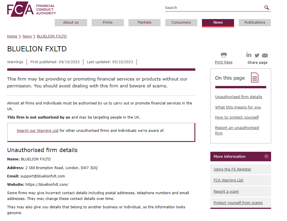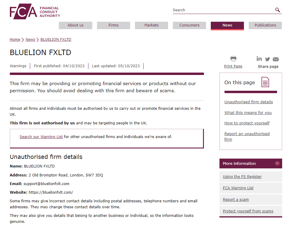 The United Kingdom Financial Conduct Authority (UK FCA) issued a warning that BLUELION FXLTD was providing financial services or products in the UK without authorisation.