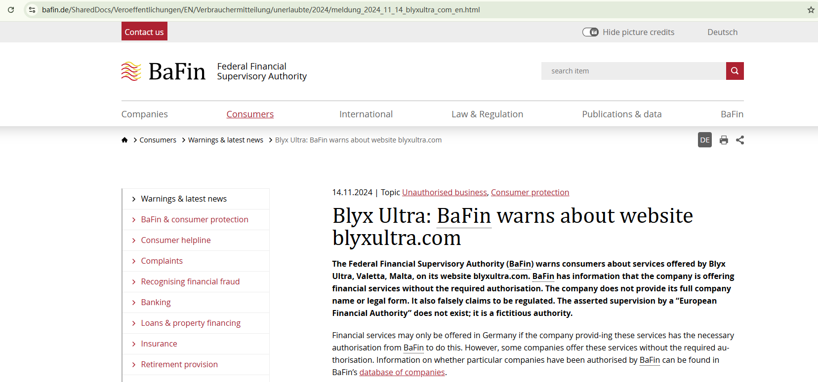 The website of Blyx Ultra seems to be quite new, with its domain registered in August 2024. The broker claims to be regulated by European Financial Authority, a fake authority that doesn't exist. The Federal Financial Supervisory Authority (BaFin) has issued a warning against Blyx Ultra, highlighting its unauthorized status.