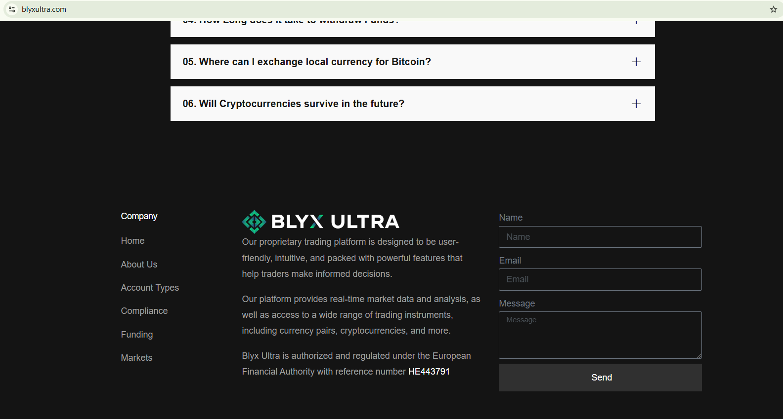 The website of Blyx Ultra seems to be quite new, with its domain registered in August 2024. The broker claims to be regulated by European Financial Authority, a fake authority that doesn't exist. The Federal Financial Supervisory Authority (BaFin) has issued a warning against Blyx Ultra, highlighting its unauthorized status.In essence, Blyx Ultra is not regulated by any governing body. Entrusting it with investors' funds is highly risky, as there are no legal protections in place to safeguard the funds.Blyx Ultra appears to be a scam.