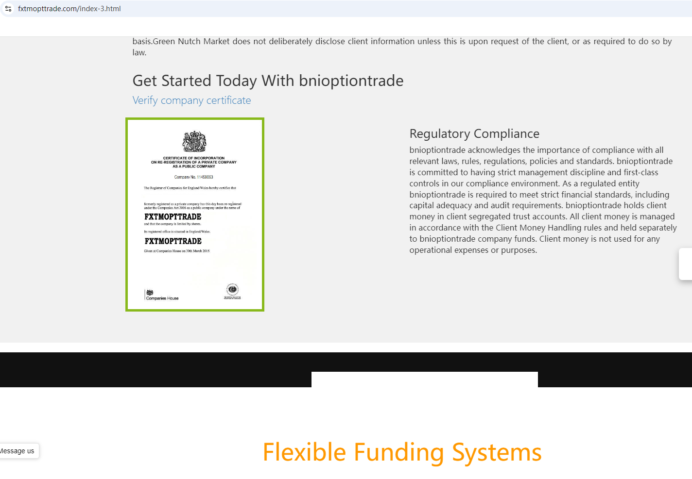 Looking closely at the website of bnioptiontrade, we can find that the website domain name, logo, and other important information do not match the name of bnioptiontrade, which is a very unreliable signal. In addition, it displays a certificate of Companies House on the website. As we all know, CH only represents company registration and cannot authorize foreign exchange. We checked the Financial Conduct Authority (FCA) and found that we did not find any matching information in the FCA.In essence, bnioptiontrade is not regulated by any governing body. Entrusting it with investors' funds is highly risky, as there are no legal protections in place to safeguard the funds.bnioptiontrade appears to be a scam.
