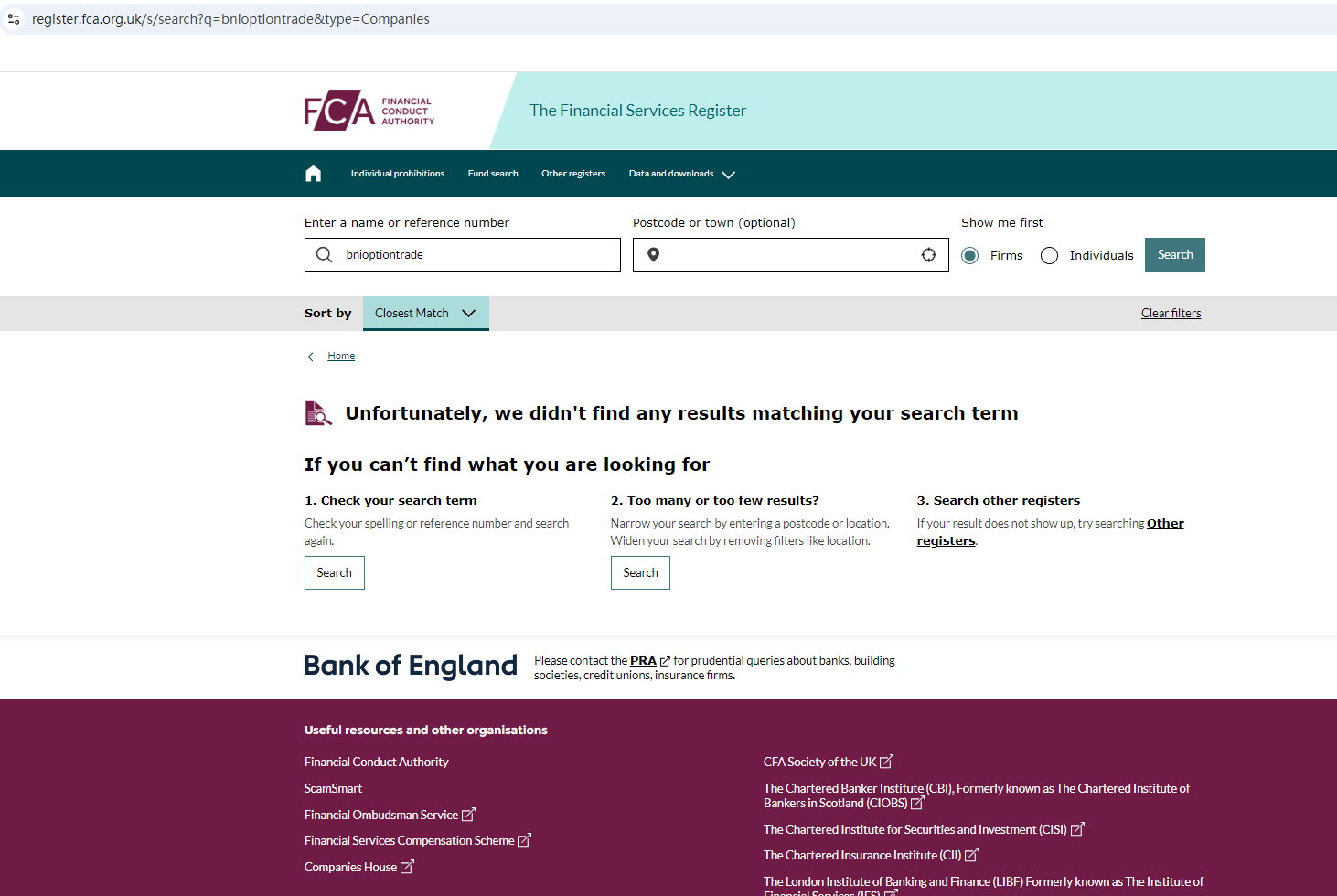 Looking closely at the website of bnioptiontrade, we can find that the website domain name, logo, and other important information do not match the name of bnioptiontrade, which is a very unreliable signal. In addition, it displays a certificate of Companies House on the website. As we all know, CH only represents company registration and cannot authorize foreign exchange. We checked the Financial Conduct Authority (FCA) and found that we did not find any matching information in the FCA.