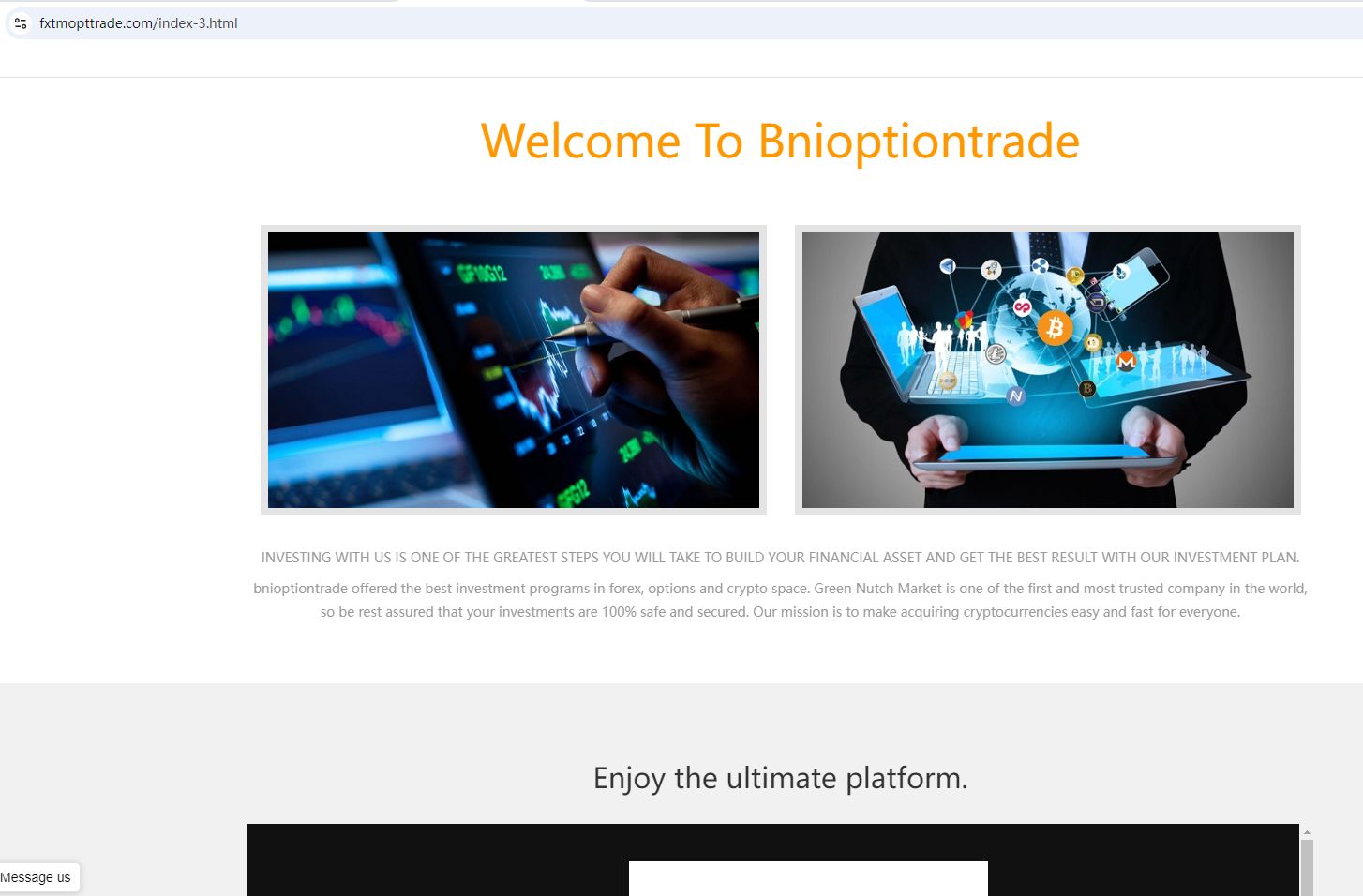 In essence, bnioptiontrade is not regulated by any governing body. Entrusting it with investors' funds is highly risky, as there are no legal protections in place to safeguard the funds.