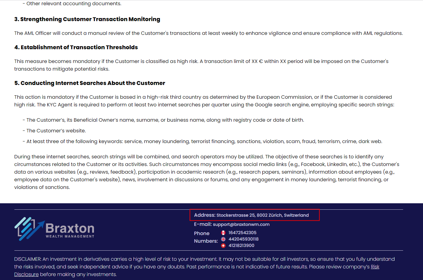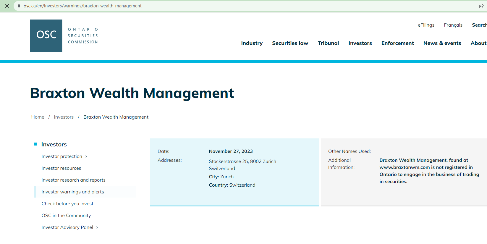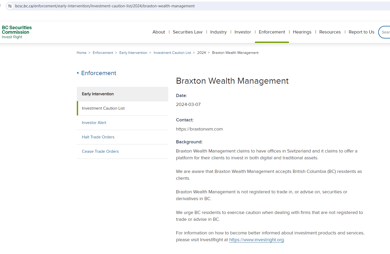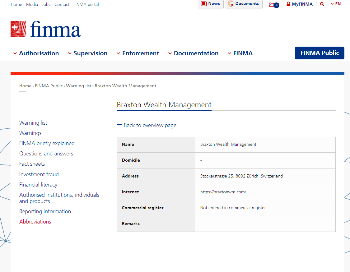 According to its webiste, Braxton Wealth Management is located in Switzerland, upon investigation, we found that the Swiss Financial Market Suprevisory Authority (FINMA) is issued a warning that Braxton Wealth Management was providing finacial services or products without authorisation.