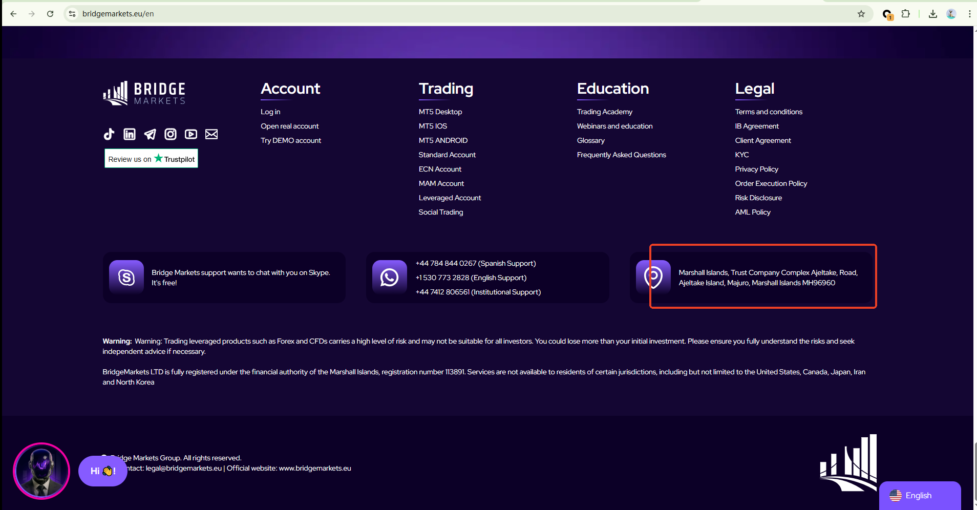 Bridge Markets claims to be operated by Bridge Markets Ltd, a company registered and regulated in the Marshall Islands under number 113891. However, we did not find any match results to the company name or the registration number in the Marshall Islands Registry (IRI). Besides, Marshall IRI is not a forex regulator and Marshall Islands currently has no forex regulator that issues licenses for forex trading or regulates entities engaging in forex. The truth is, Bridge Markets is not under valid regulation by any regulators to provide investment services. Investors' funds in this company are unsafe and cannot be protected by any law. Therefore, it is a scam.