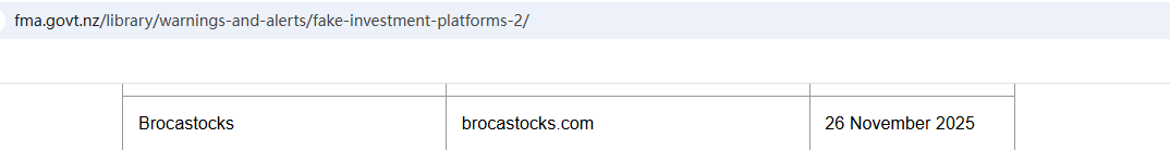 On Nov 26, 2025, the New Zealand Financial Markets Authority (NZ FMA) added Brocastocks to its warning list, stating that this is a fake investment platform. https://www.fma.govt.nz/library/warnings-and-alerts/fake-investment-platforms-2/