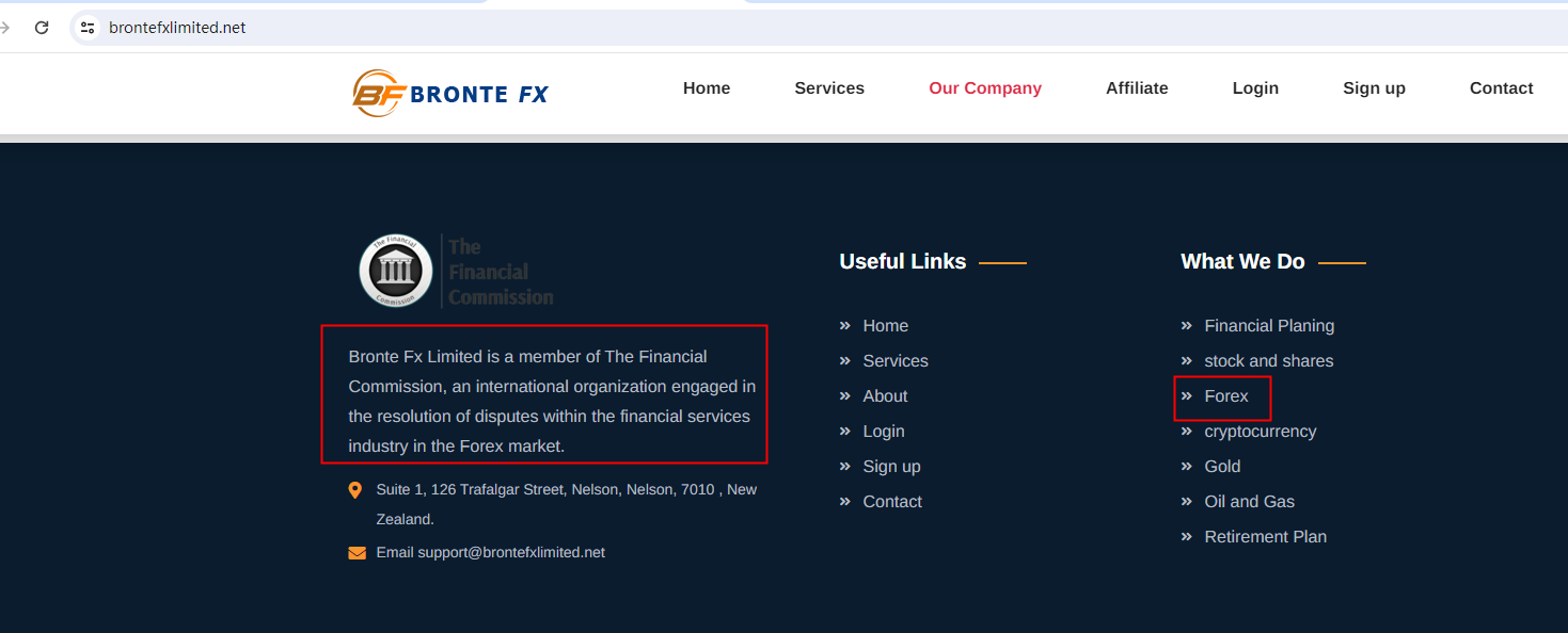 Bronte FX claims to be registered in New Zealand, but the Financial Markets Authority (FMA) issued a warning that Bronte FX was providing finacial services or products without registration. It falsely claims to be a registered company in New Zealand, using the address and business registration details of another company, Bronte Investments Limited. A representative of Bronte Investments Limited has confirmed that their company is not associated with this website. It is a red flag.Bronte FX also claims to be regulated by The Financial Commission (FinCom), we searched the FinCom but found no matching results.The truth is that Bronte FX is not regulated by any regulators. Letting it hold or control investors' money is unsafe, and the money can not be protected by any laws.Bronte FX is a scam.