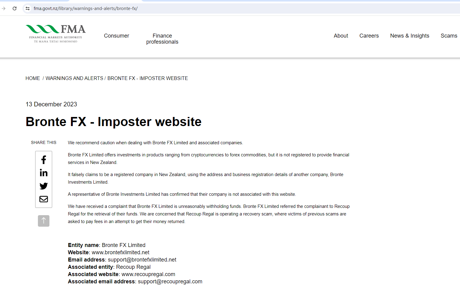 Bronte FX claims to be registered in New Zealand, but the Financial Markets Authority (FMA) issued a warning that Bronte FX was providing finacial services or products without registration. It falsely claims to be a registered company in New Zealand, using the address and business registration details of another company, Bronte Investments Limited. A representative of Bronte Investments Limited has confirmed that their company is not associated with this website. It is a red flag.