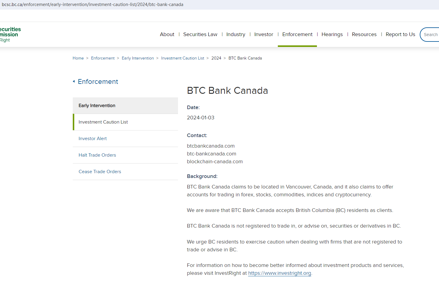 the British Columbia Securities Commission (BCSC) issued a warning that BTC Bank Canada was providing financial services or products without authorisation.