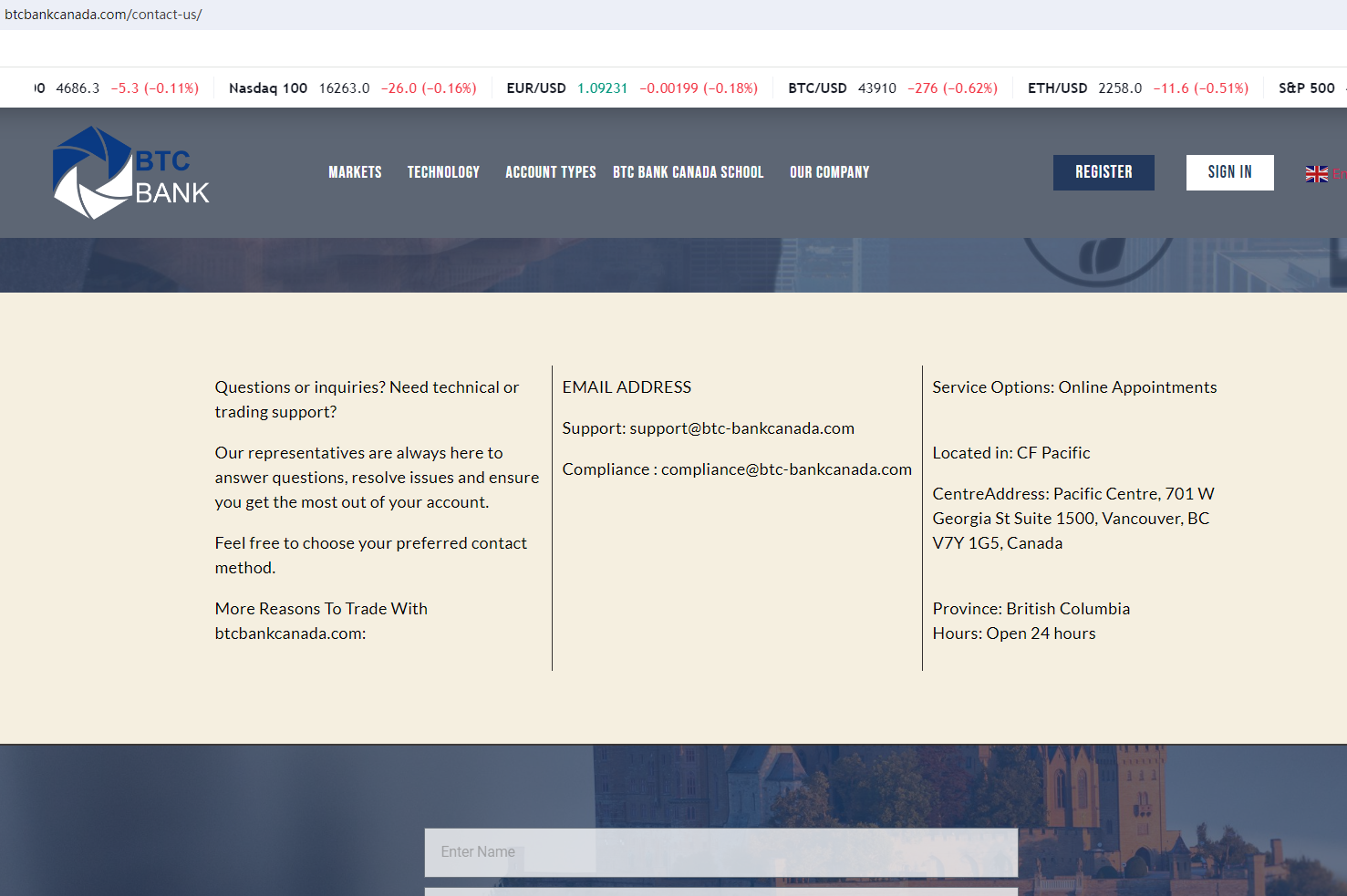 According to its website, it is located in Canada. Upon investigation, no matching information was found in the Investment Industry Regulatory Organization of Canada (IIROC).the British Columbia Securities Commission (BCSC) issued a warning that BTC Bank Canada was providing financial services or products without authorisation.The truth is that BTC Bank Canada is not regulated by any regulators. Letting it hold or control investors' money is unsafe and the money cannot be protected by any laws.Therefore, BTC Bank Canada is a scam.