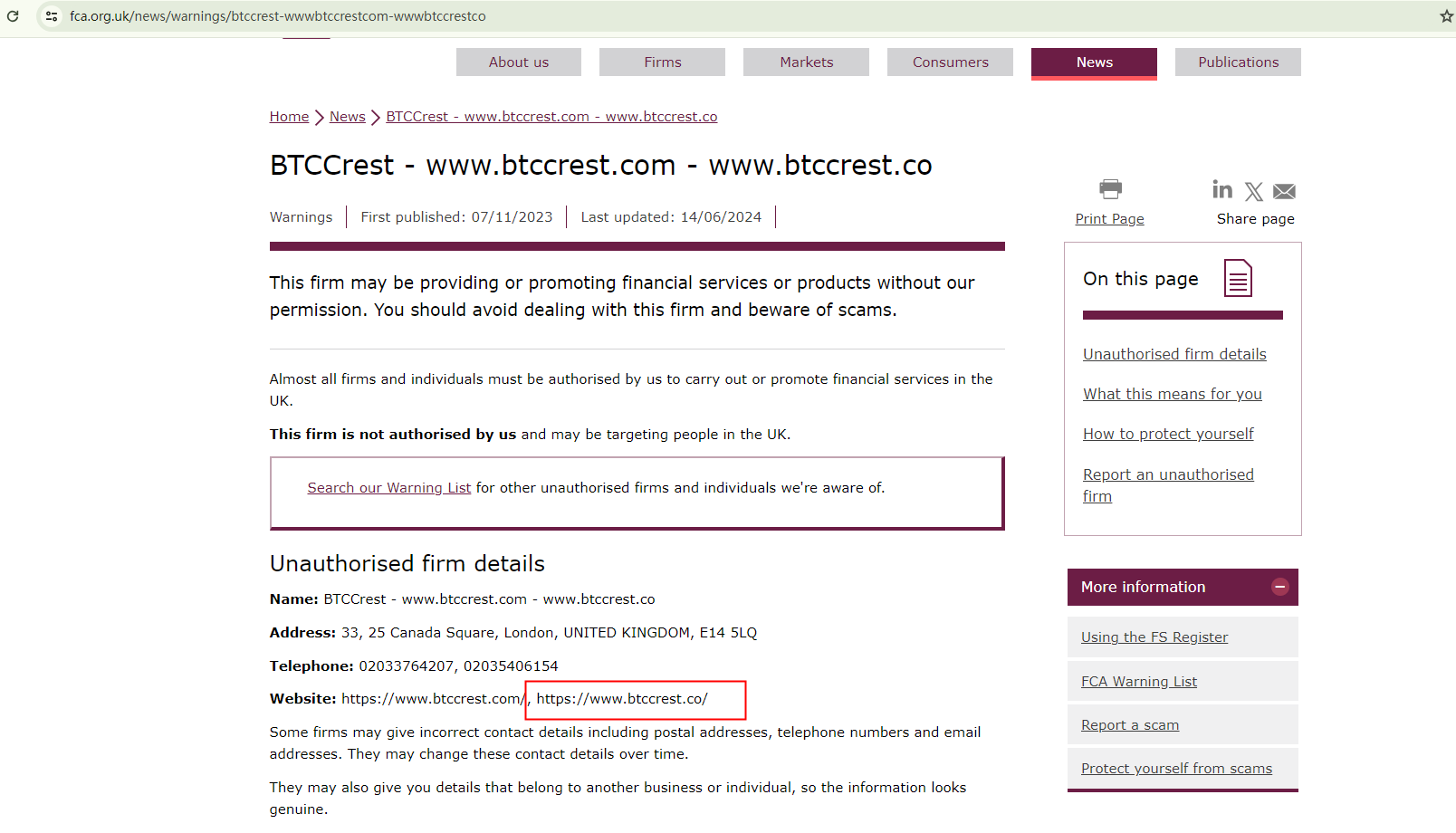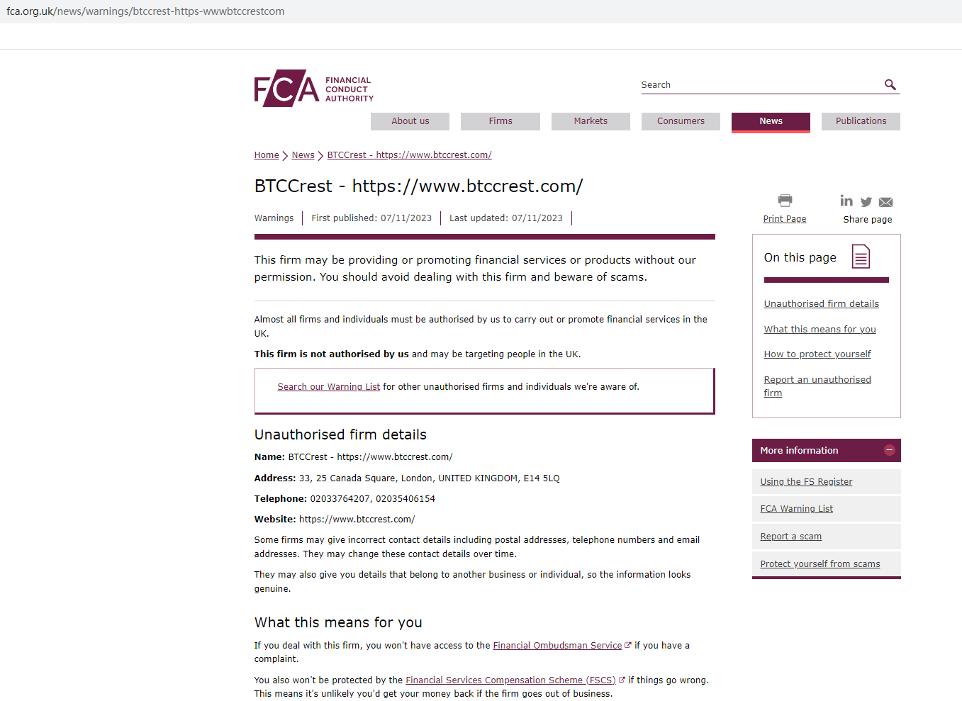 BTCCrest located in the UK, but upon investigation, we found that the United Kingdom Financial Conduct Authority (UK FCA) issued a warning that BTCCrest was providing finacial services or products without authorisation.