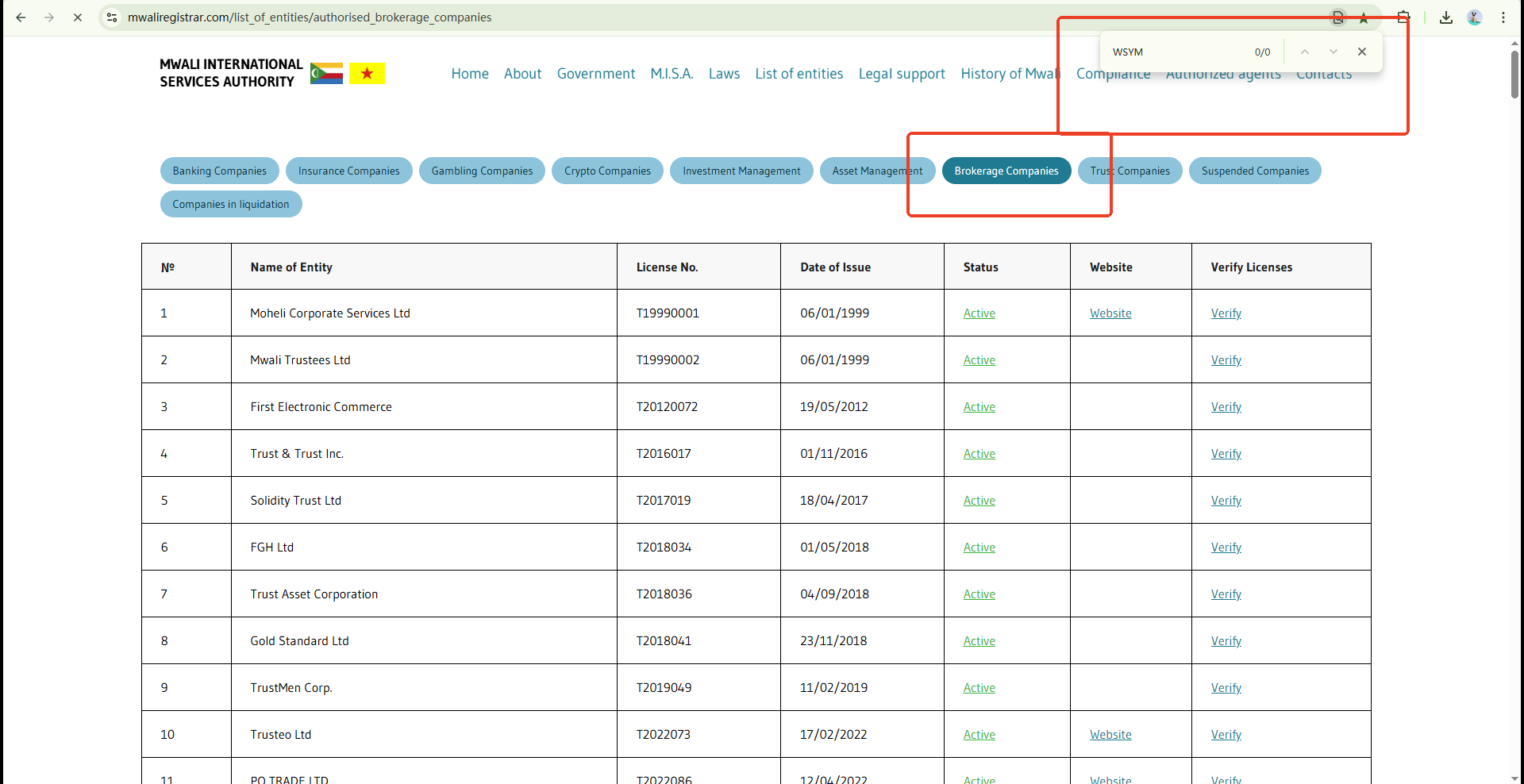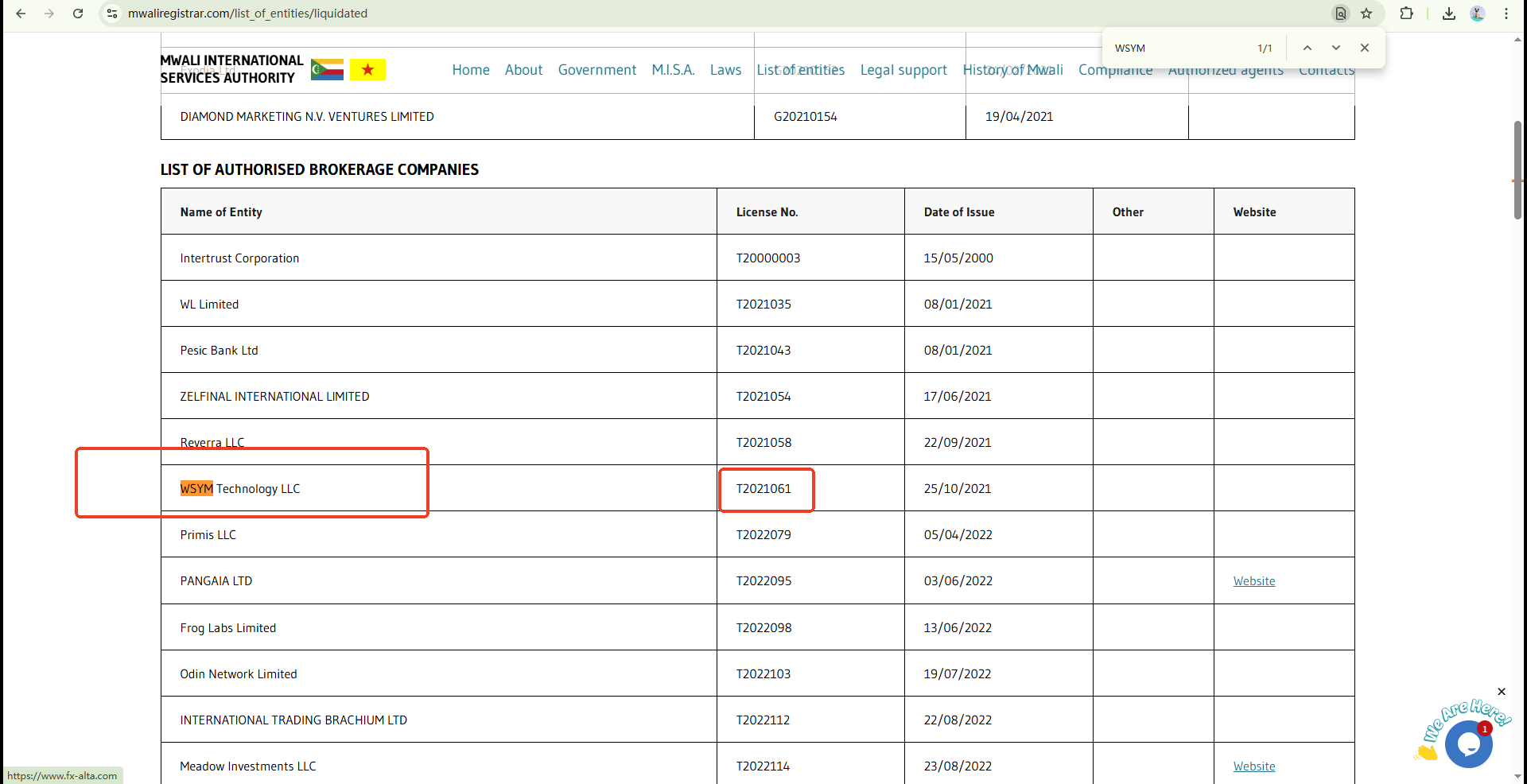 Upon investigation, we can confirm that WSYM Technology is listed as an authorized company by the Mwali International Services Authority (MISA). However, please note that MISA currently lists the company as a liquidated company, which indicates that the company may not be able to operate and poses a potential risk to investors.