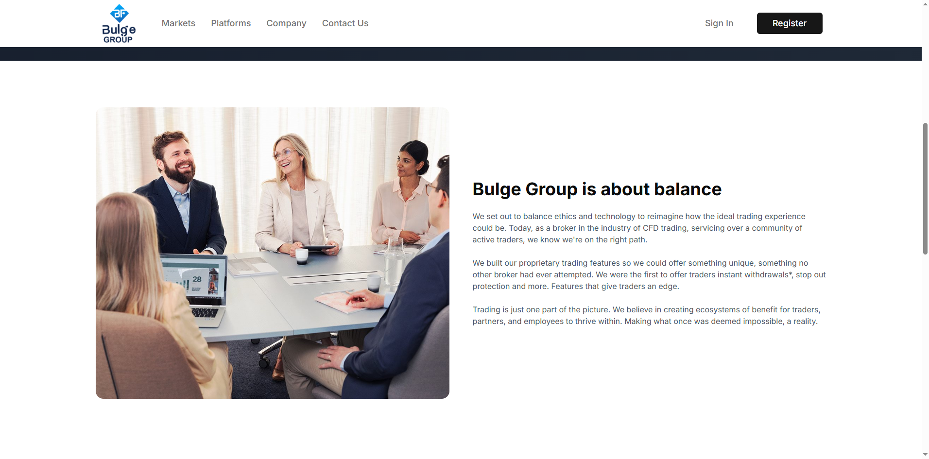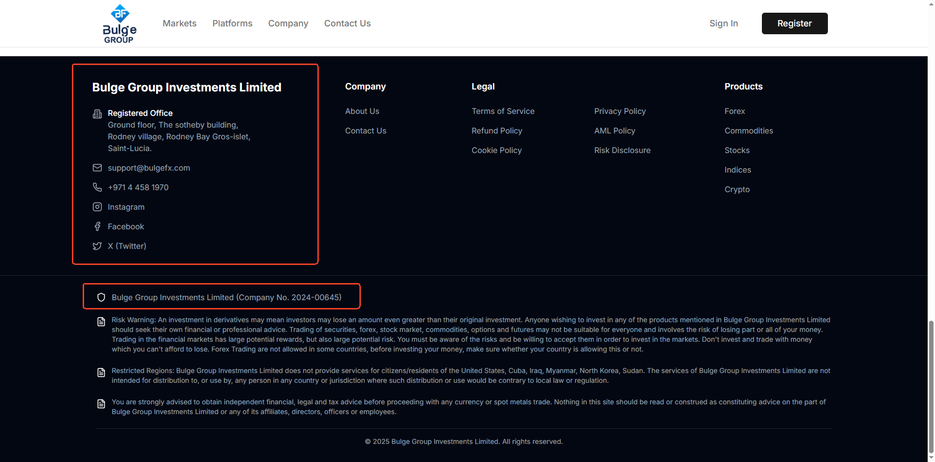 Bulge Group claims to operate under Bulge Group Investments Limited. However, it does not provide any regulatory information, only claiming to be registered in Saint Lucia. While we can confirm that a company with the same name exists in the Saint Lucia International Financial Centre (IFC) registry, this registration merely grants it International Business Company (IBC) status. This does not constitute a valid financial licence. The IFC neither regulates nor licenses forex trading activities.