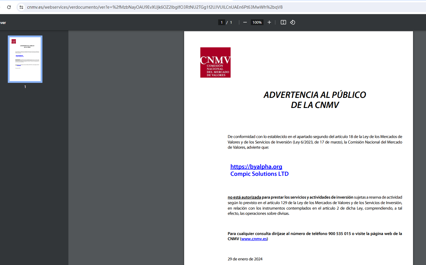 The Comisión Nacional del Mercado de Valores (CNMV) issued a warning that ByAlpha was providing finacial services or products without authorisation.