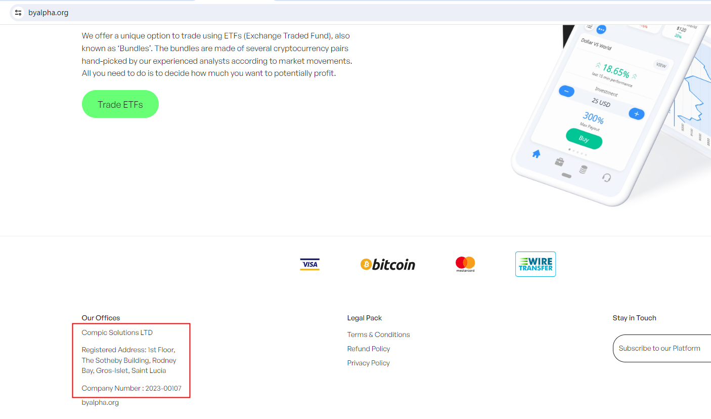 ByAlpha claims to be operated by Compic Solutions LTD, which is registered in Saint Lucia, we searched the Financial Services Regulatory Authority (FSRA) but found no matching results.The Comisión Nacional del Mercado de Valores (CNMV) issued a warning that ByAlpha was providing finacial services or products without authorisation.The truth is that ByAlpha is not regulated by any regulators. Letting it hold or control investors' money is unsafe, and the money can not be protected by any laws.ByAlpha is a scam.