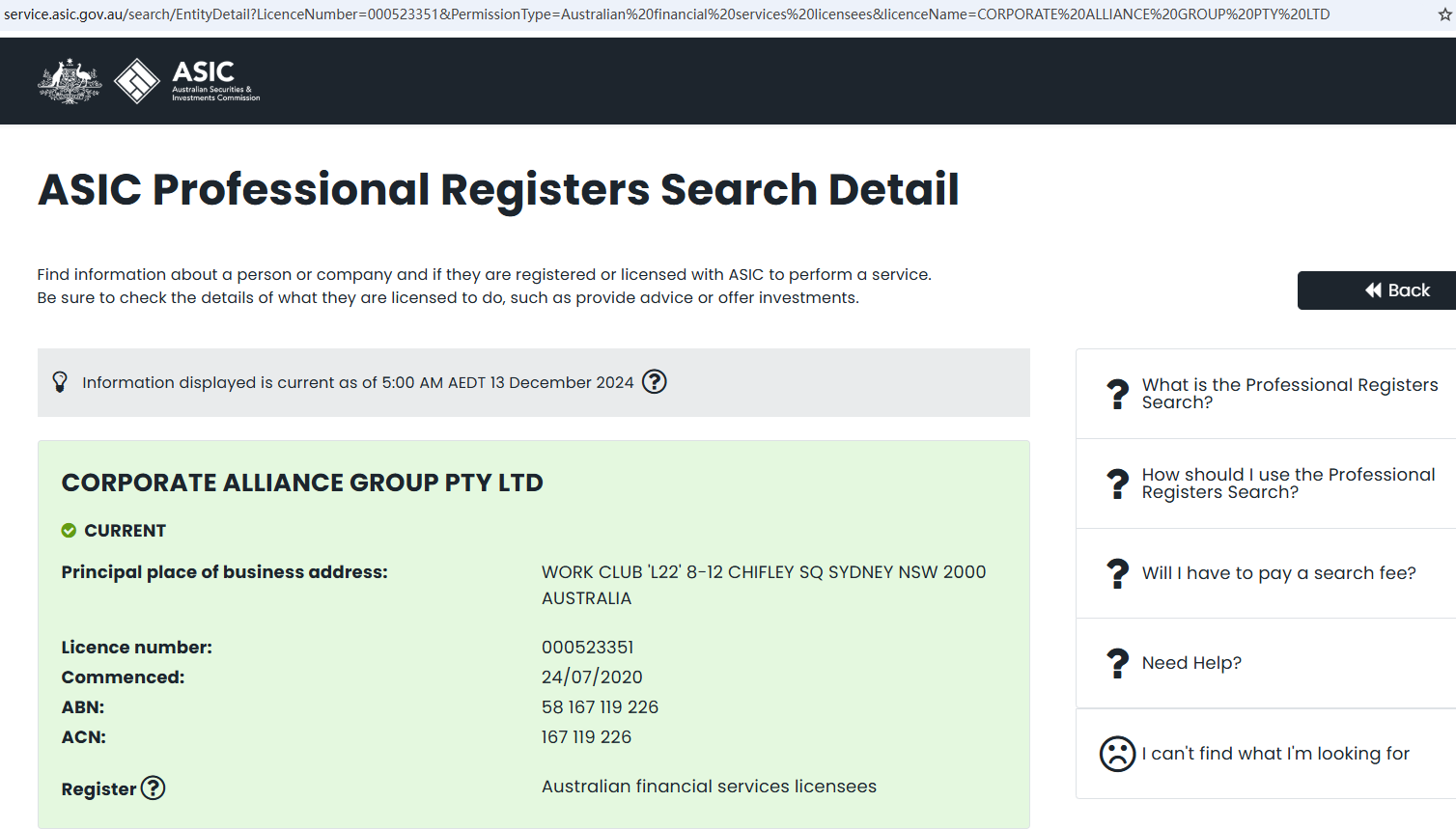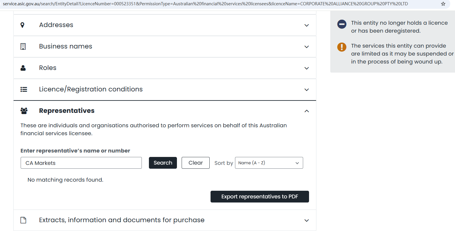 We verified that CORPORATE ALLIANCE GROUP PTY LTD is regulated by the ASIC with AFSL number 523351, which is not disclosing the licensee's web address. And there is no representative named of CA Markets. And CORPORATE ALLIANCE GROUP only provides financial services to institutional clients.