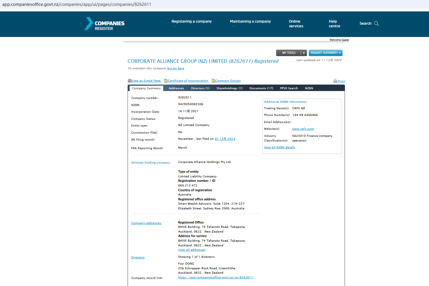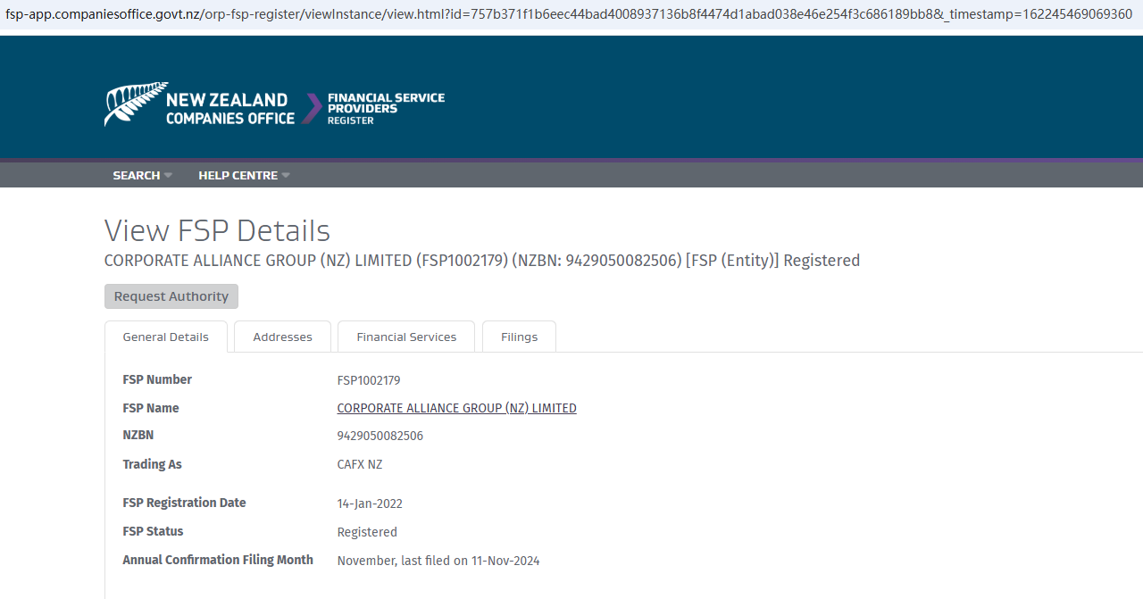 However, CORPORATE ALLIANCE GROUP (NZ) LIMITED is registered with FSP1002179, but their trading name is CAFX NZ(web: www.cafx.com).