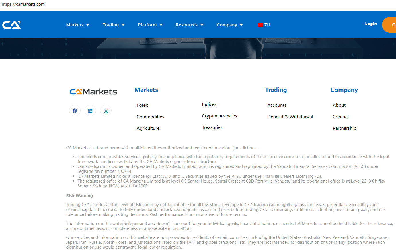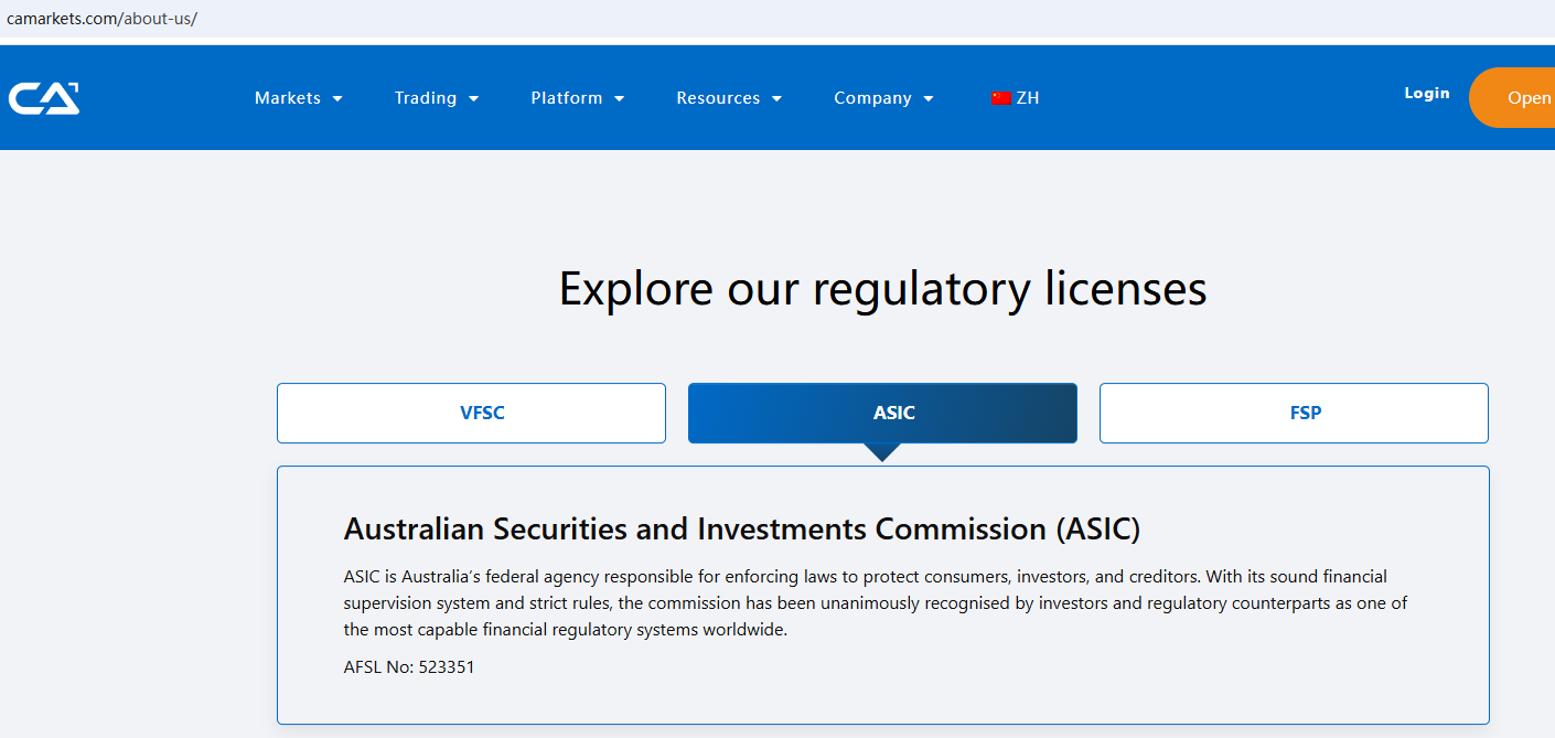 CA Markets claims to be a brand name with multiple entities, is a CFDs broker licensed and regulated by theVanuatu Financial Services Commission (VFSC) with license number 700714, the Australian Securities and Investments Commission (ASIC) with AFSL number 523351 and the New Zealand Financial Service Provider (FSP) under registration number 1002179, offering a range of investment products to traders, including forex, shares, indices, commodities, ETFs, bonds and and more instruments for trading in global markets.