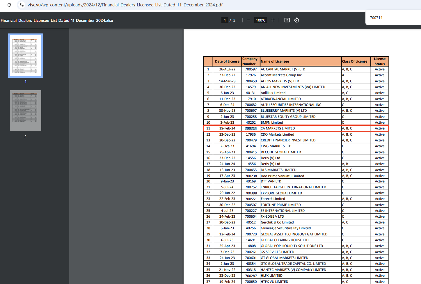 Upon investigation, we found that CA MARKETS LIMITED is licensed by the VFSC with number 700714 , but not disclosing the licensee's web address.