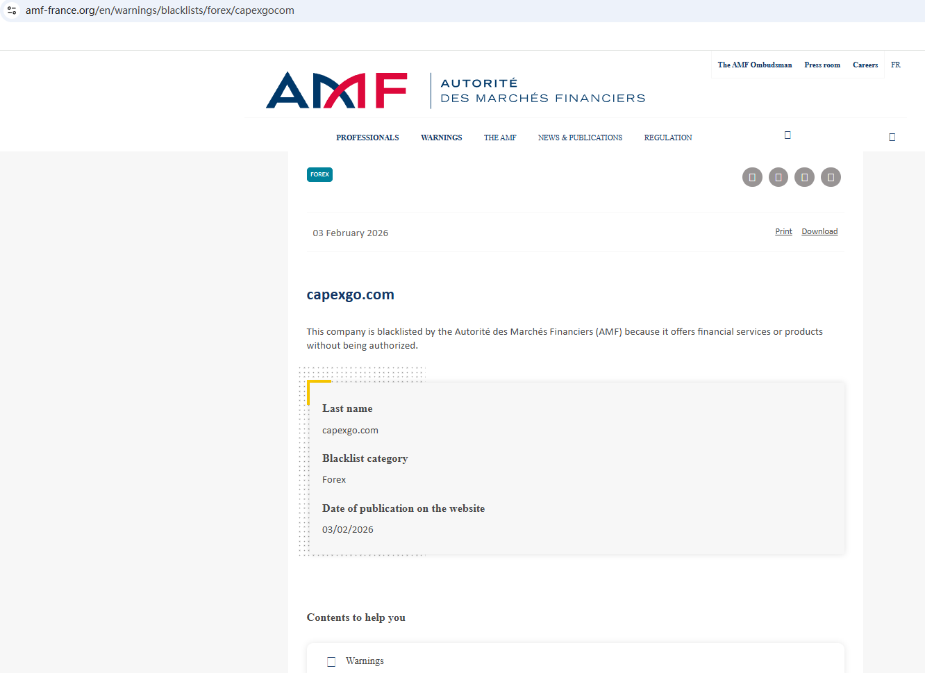 On Feb 3, 2026, the Financial Authority (Autorité des Marchés Financiers, AMF) added CapexGo to warning list for it being an unauthorized company engaging in forex activities. https://www.amf-france.org/en/warnings/blacklists/forex/capexgocom