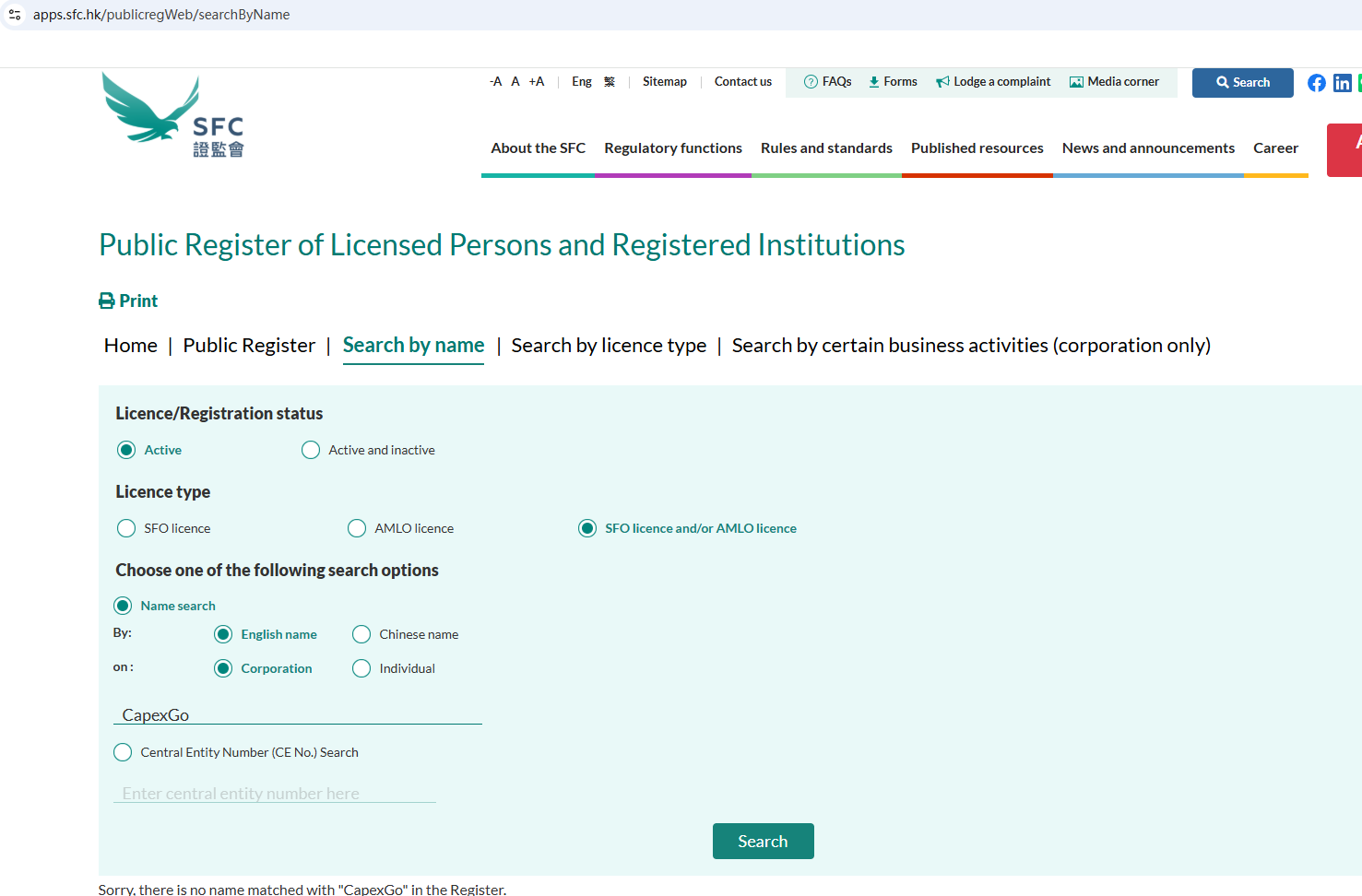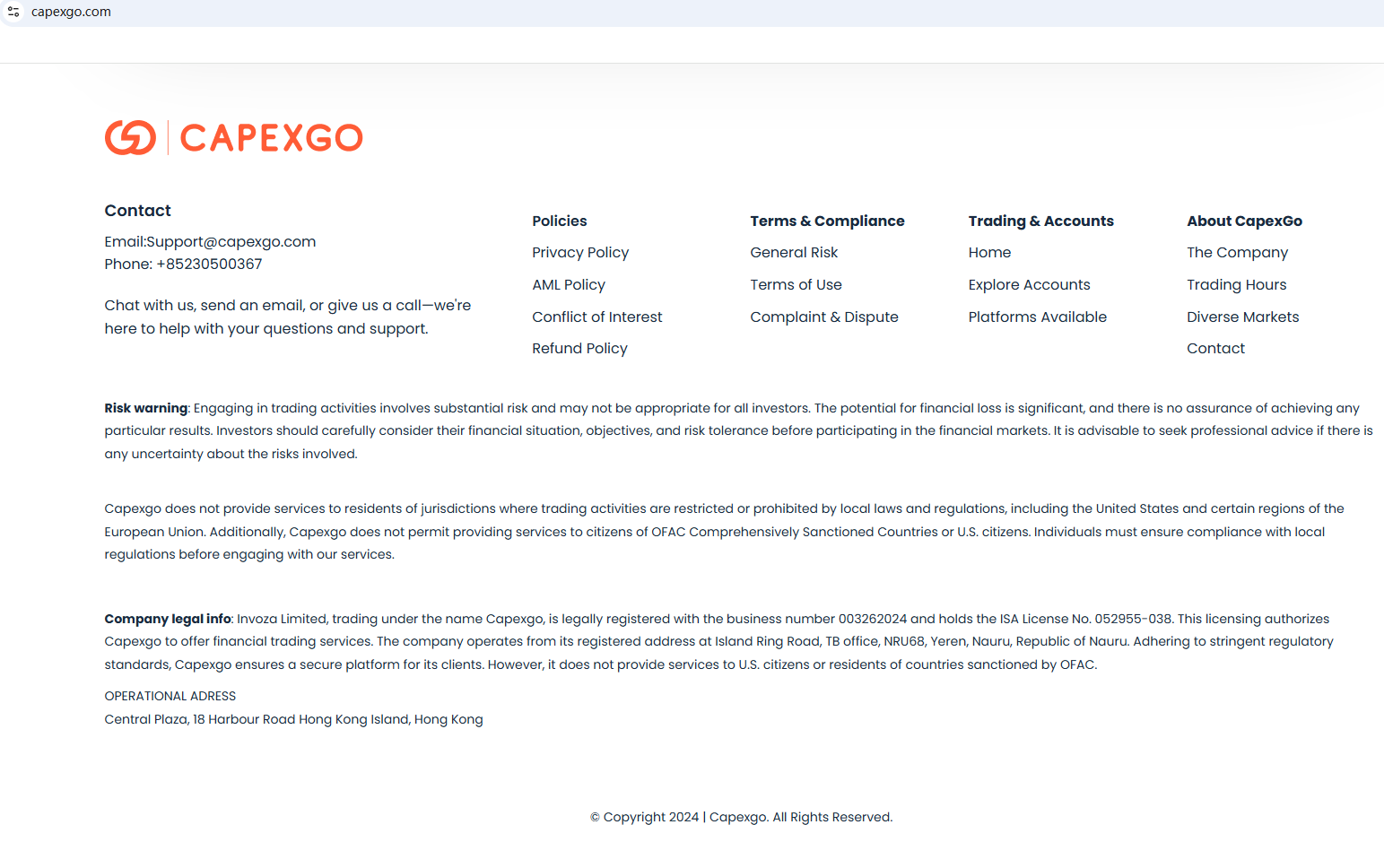 According to its website, it is located in Hong Kong. Upon investigation, no matching information was found in the Securities and Futures Commission (SFC). In addition, the Financial Authority (Autorité des Marchés Financiers, AMF) added CapexGo to warning list for it being an unauthorized company engaging in forex activities.