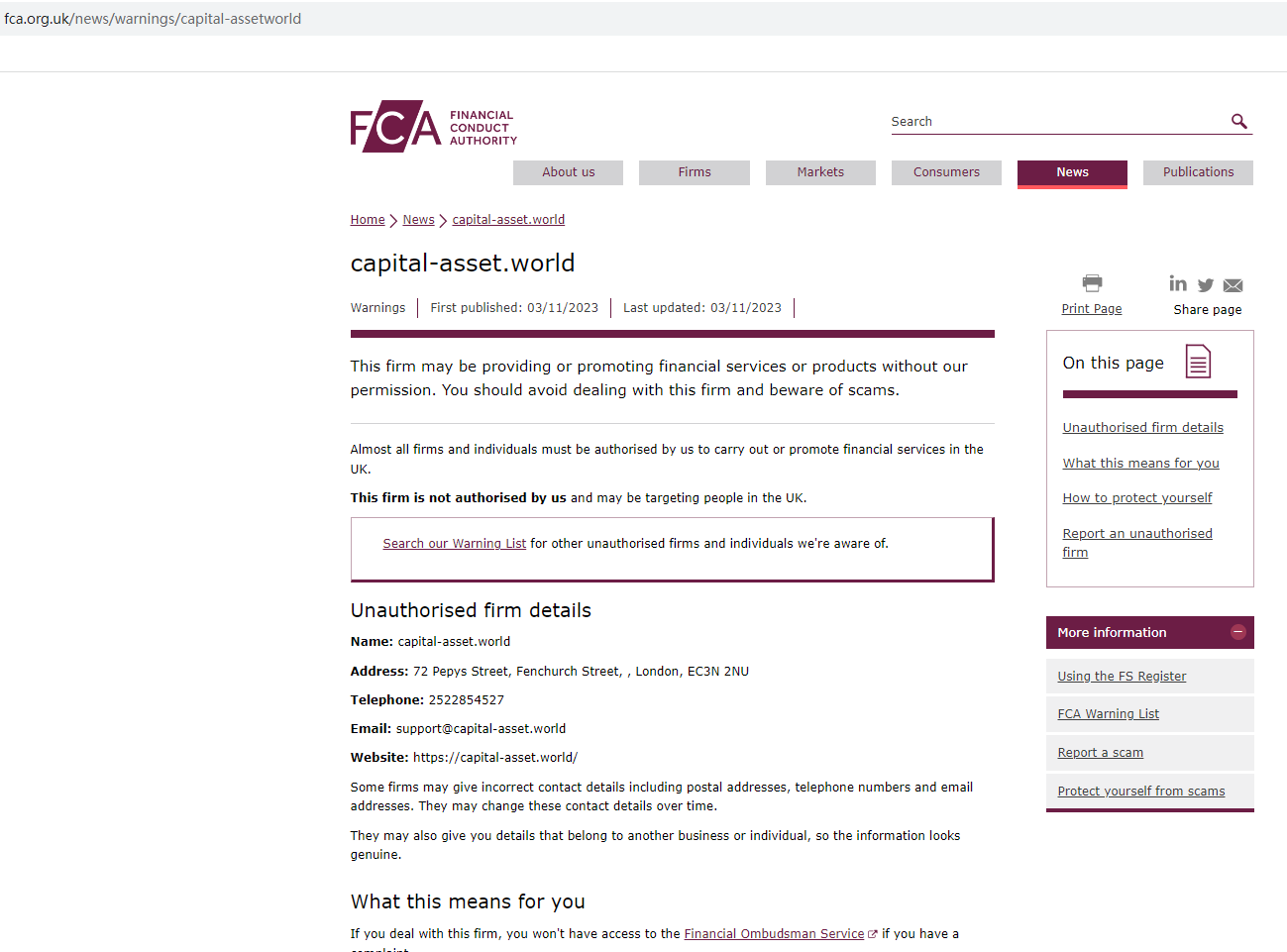On 3 November 2023, it was found that the the United Kingdom Financial Conduct Authority (UK FCA) had updated the warning and found that the Capital assets.world was continuing to act erroneously. You may visit: https://www.fca.org.uk/news/warnings/capital-assetworld