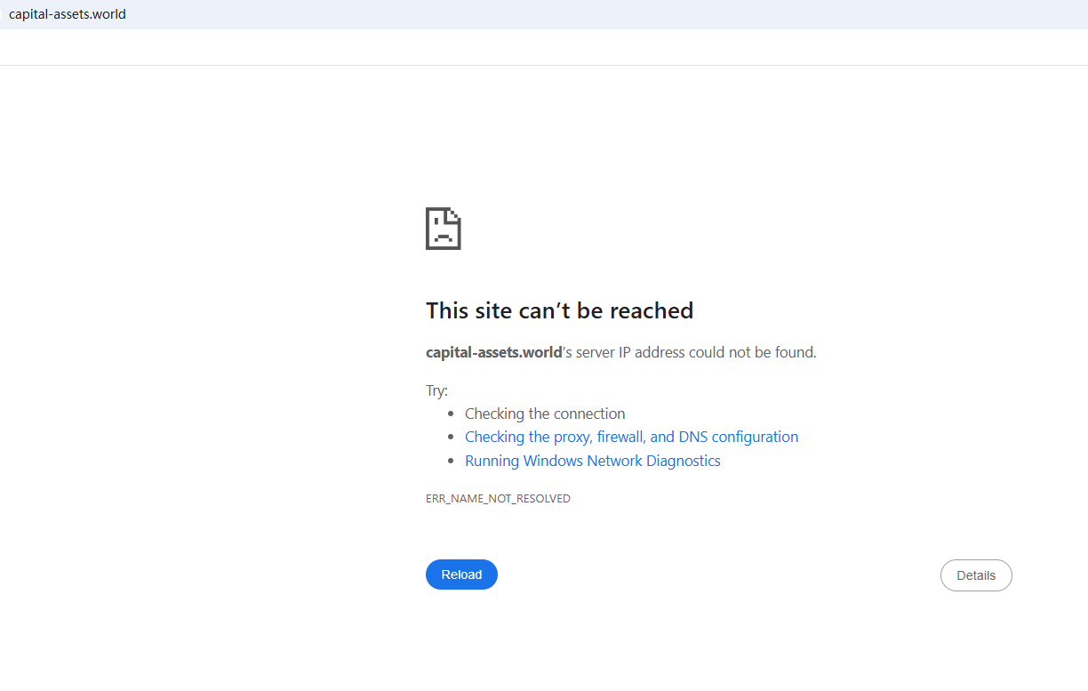 BrokersView found that the domain "https://capital-assets.world/" is currently inaccessible. This is widely regarded as a significant red flag, as the suspension of a broker's website often points to underlying regulatory or operational issues.