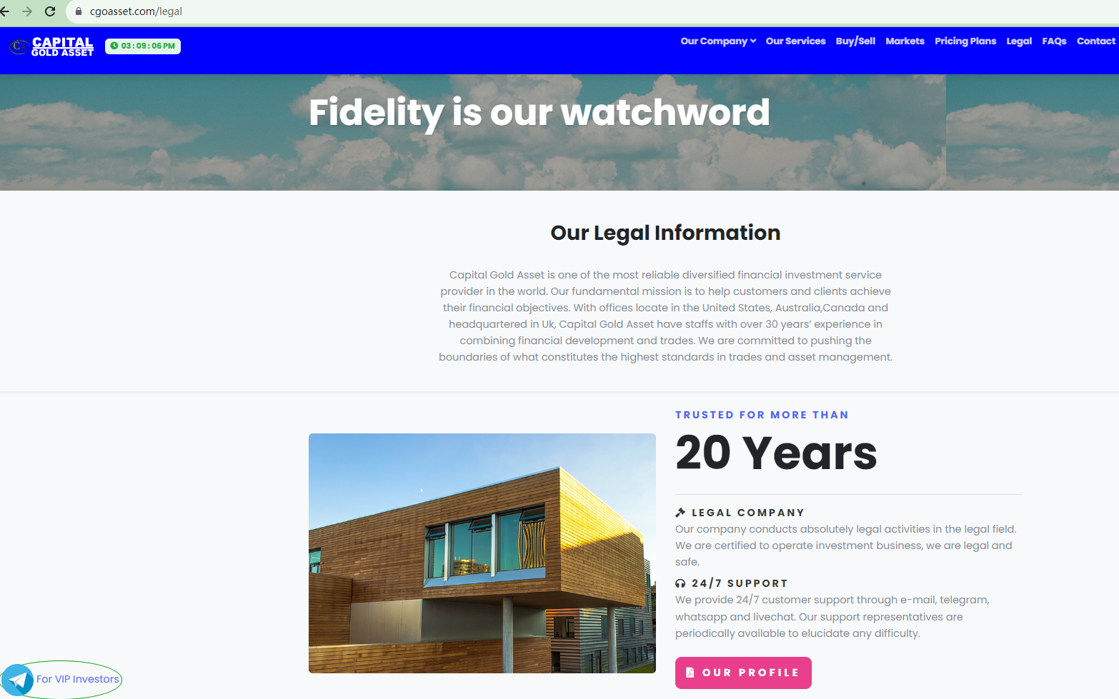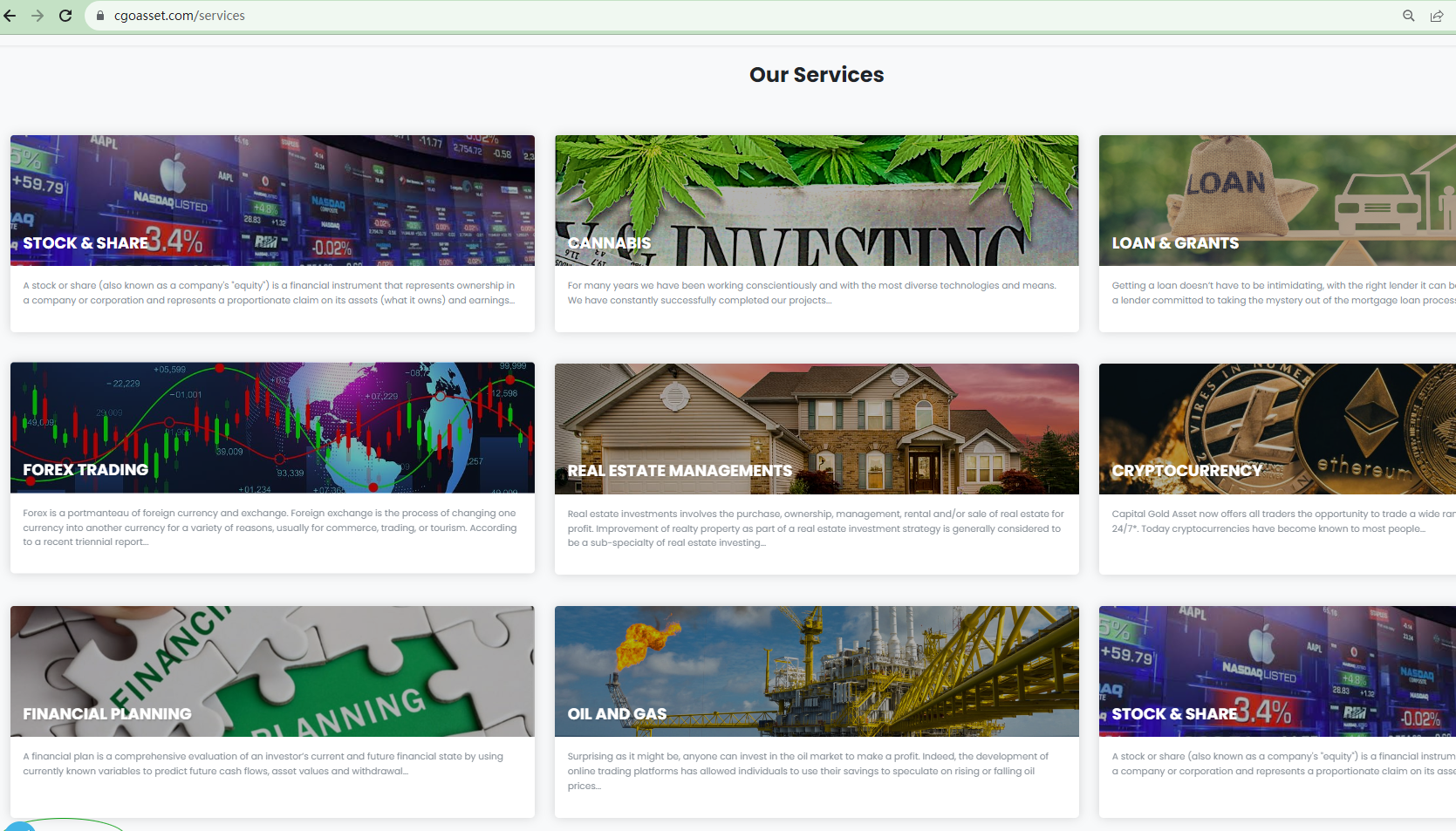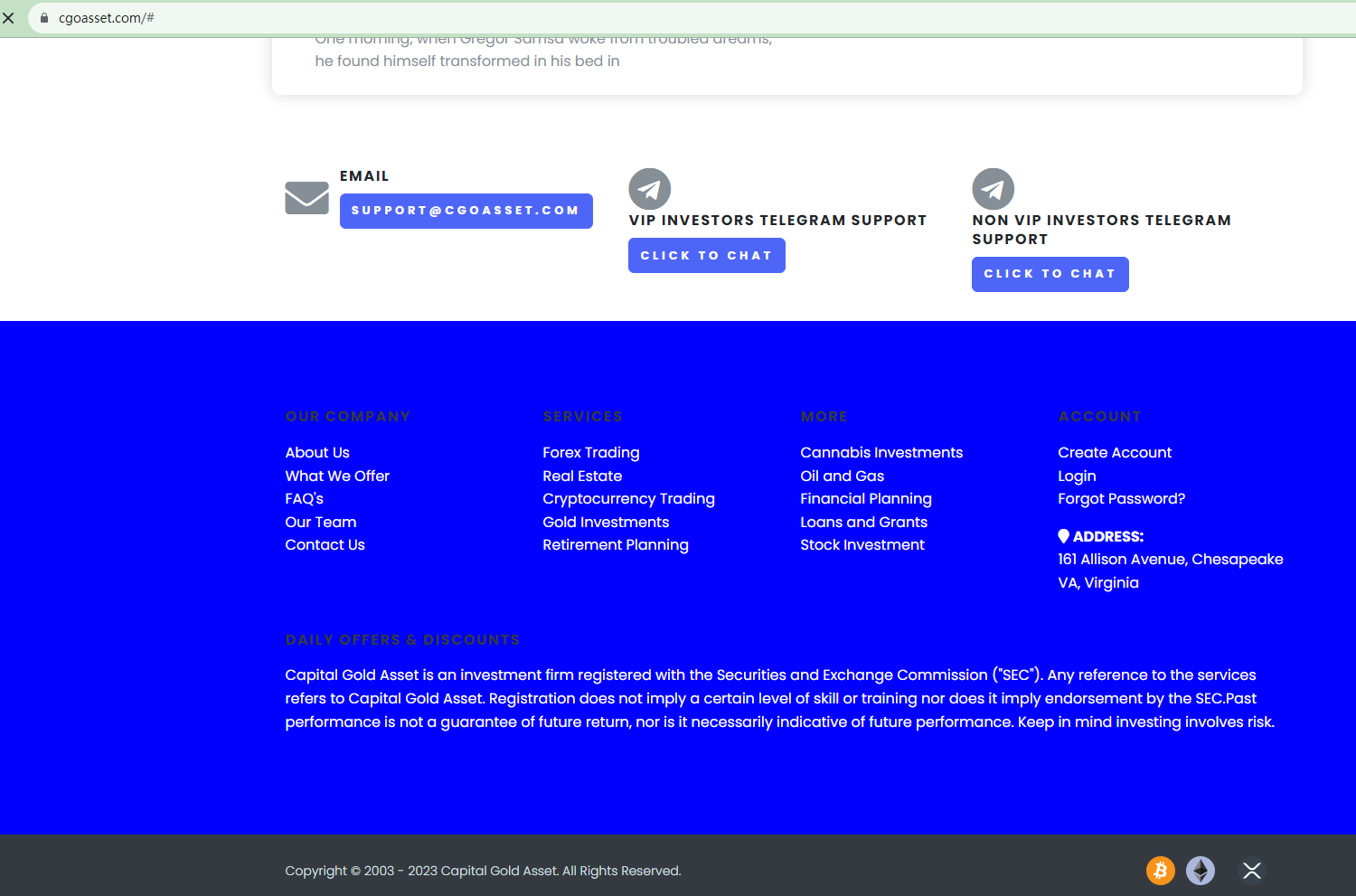 While Capital Gold Asset purports to be an established, licensed online trading platform, our investigation suggests otherwise.Firstly, the company claims to be registered with the Securities and Exchange Commission (SEC), but our search found no corresponding entries in the SEC registry.Secondly, Capital Gold Asset asserts it has been trusted by customers for more than 20 years. However, its domain, cgoasset.com, was first registered in September 2022. This discrepancy raises questions about the platform's honesty.Thirdly, Capital Gold Asset vaguely states it is based in Chesapeake, an independent city in Virginia, United States. However, it provides no further details about its exact location or a phone hotline for customers to contact its team. This lack of transparency is a potential red flag. Considering its offerings, it must be registered as a member of the National Futures Association (NFA). However, our search for it in the NFA registry didn't return any records.In essence, Capital Gold Asset is not regulated by any governing body. Entrusting this broker with investors' funds is highly risky, as there are no legal protections in place to safeguard the funds.Based on these findings, it is clear that Capital Gold Asset is a scam.