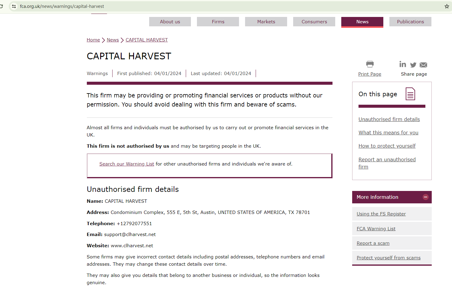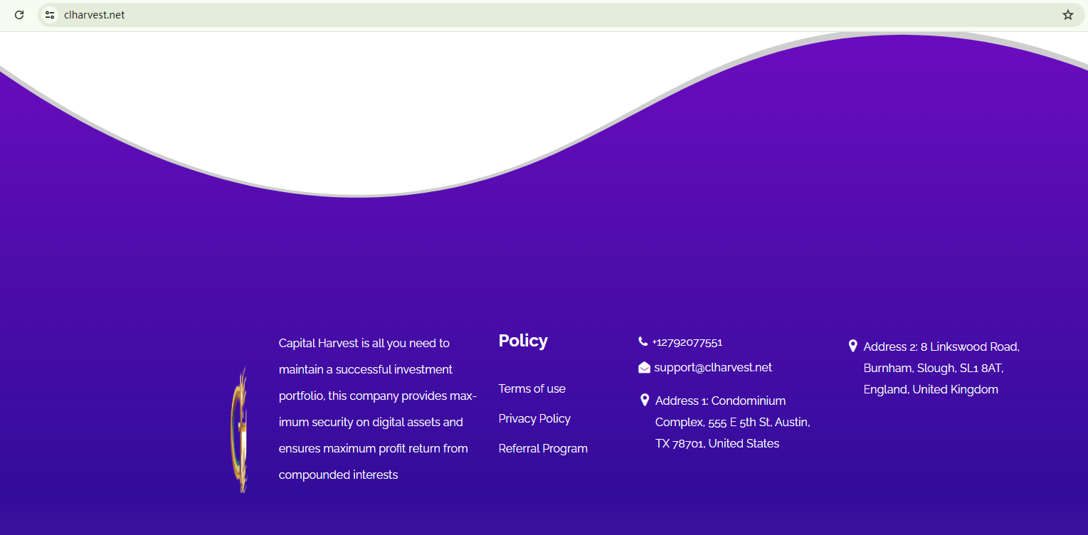 Capital Harvest openly admits that it is an unregulated trading platform. However, this admission should not be mistaken for honesty. It's not uncommon for fraudulent brokers to use such tactics to gain the trust of unsuspecting investors by creating an illusion of being unlicensed yet reliable. It's crucial to remember that verifying a broker's licenses is of utmost importance. Without regulatory oversight, any claims made by a broker cannot be trusted.The company claims to have offices in the UK and the US. We conducted a search for this company in the registers of the Financial Conduct Authority (FCA) and the National Futures Association (NFA). The FCA has issued a warning against Capital Harvest, and there were no matching entries in the NFA register.In summary, Capital Harvest is not regulated by any governing body. Investing with this broker carries a high risk, as there are no legal protections in place to safeguard investors' funds.It appears that Capital Harvest may be a scam.