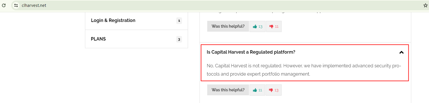 Capital Harvest openly admits that it is an unregulated trading platform. However, this admission should not be mistaken for honesty. It's not uncommon for fraudulent brokers to use such tactics to gain the trust of unsuspecting investors by creating an illusion of being unlicensed yet reliable. It's crucial to remember that verifying a broker's licenses is of utmost importance. Without regulatory oversight, any claims made by a broker cannot be trusted.