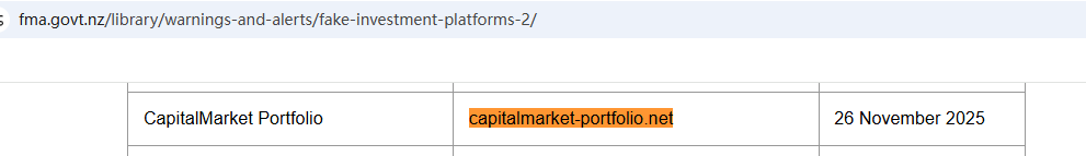 On Nov 26, 2025, the New Zealand Financial Markets Authority (NZ FMA) added Capital Market Portfolio to its warning list, stating that this is a fake investment platform. https://www.fma.govt.nz/library/warnings-and-alerts/fake-investment-platforms-2/