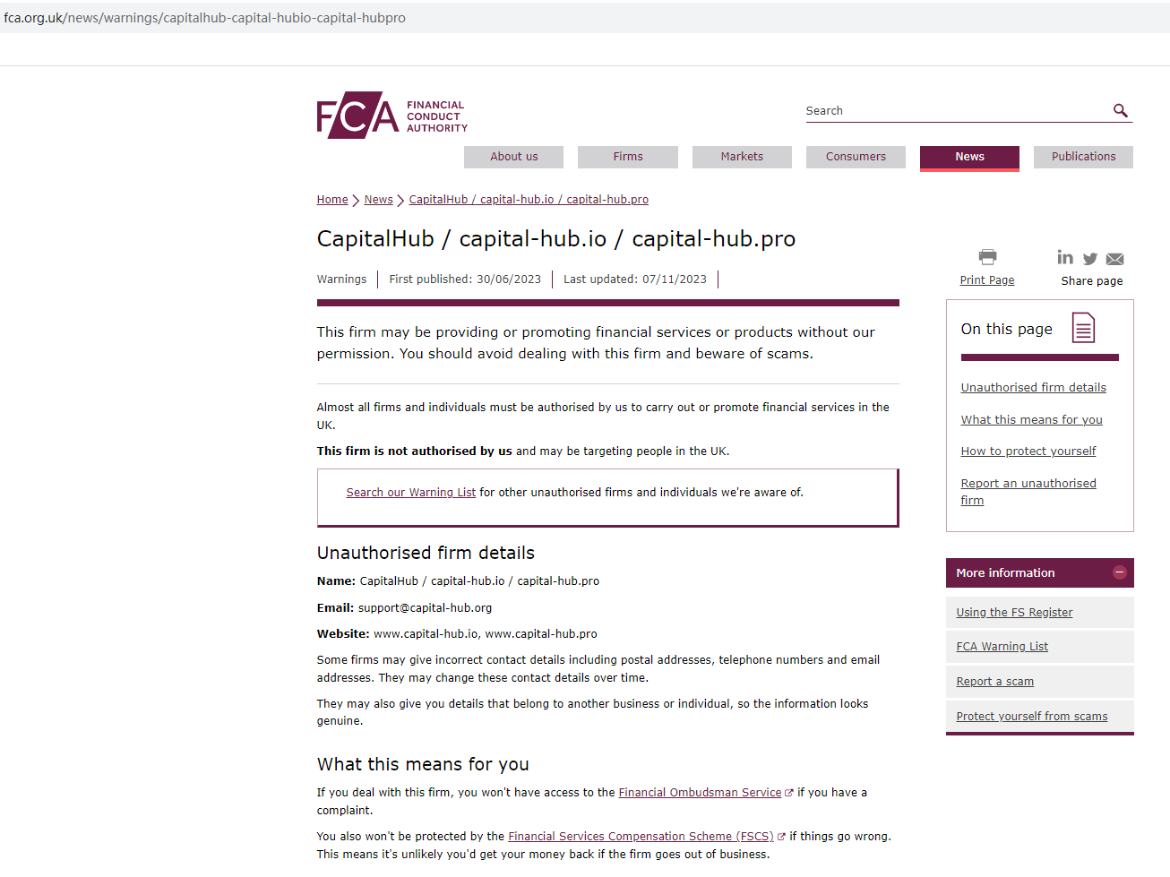 CapitalHub fails to provide regulatory information and licensing data, a clear scam indicator suggesting that it is not supervised by any regulatory body. It is typical for legitimate brokers to prominently display their accreditation and licenses, whereas CapitalHub doesn't offer such information. In addition, the Ontario Securities Commission (OSC) has issued a warning against this broker, stating that it is not registered in Ontario to engage in the business of trading in securities.