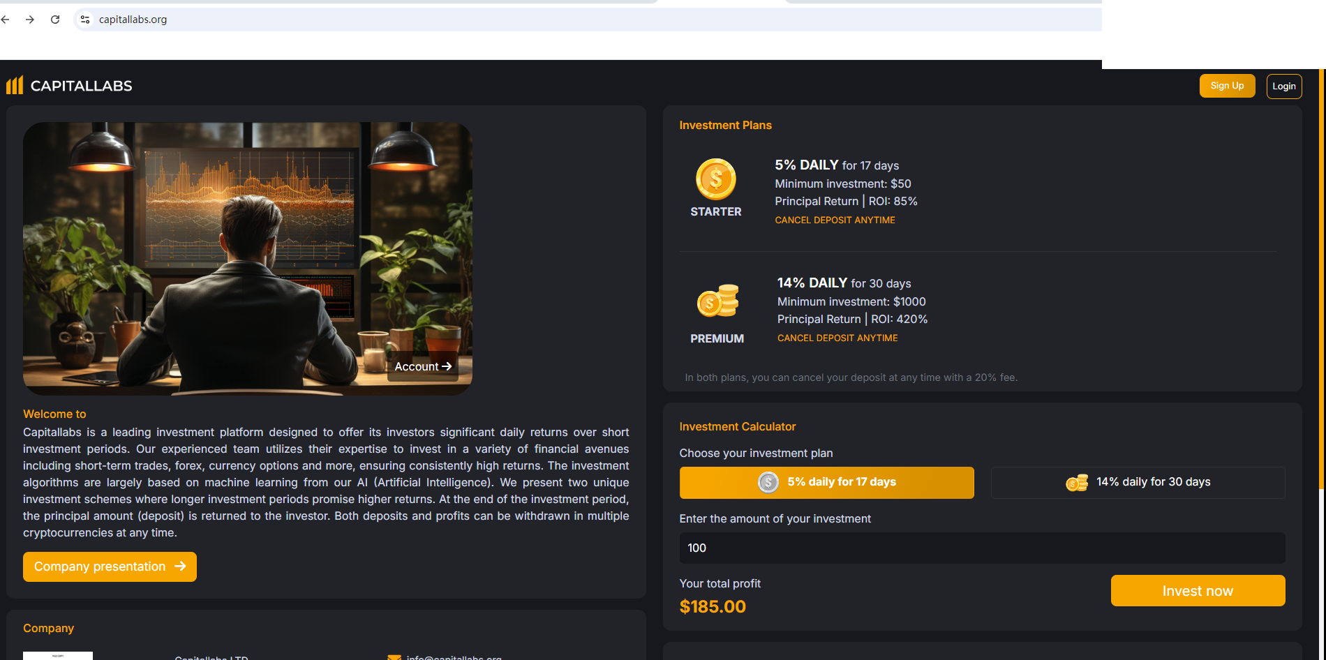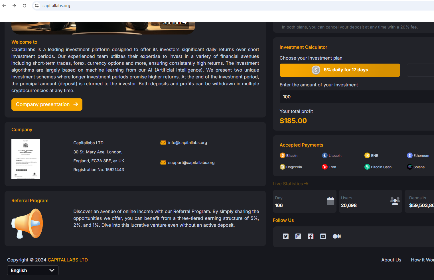 In essence, Capitallabs Ltd is not regulated by any governing body. Entrusting it with investors' funds is highly risky, as there are no legal protections in place to safeguard the funds.