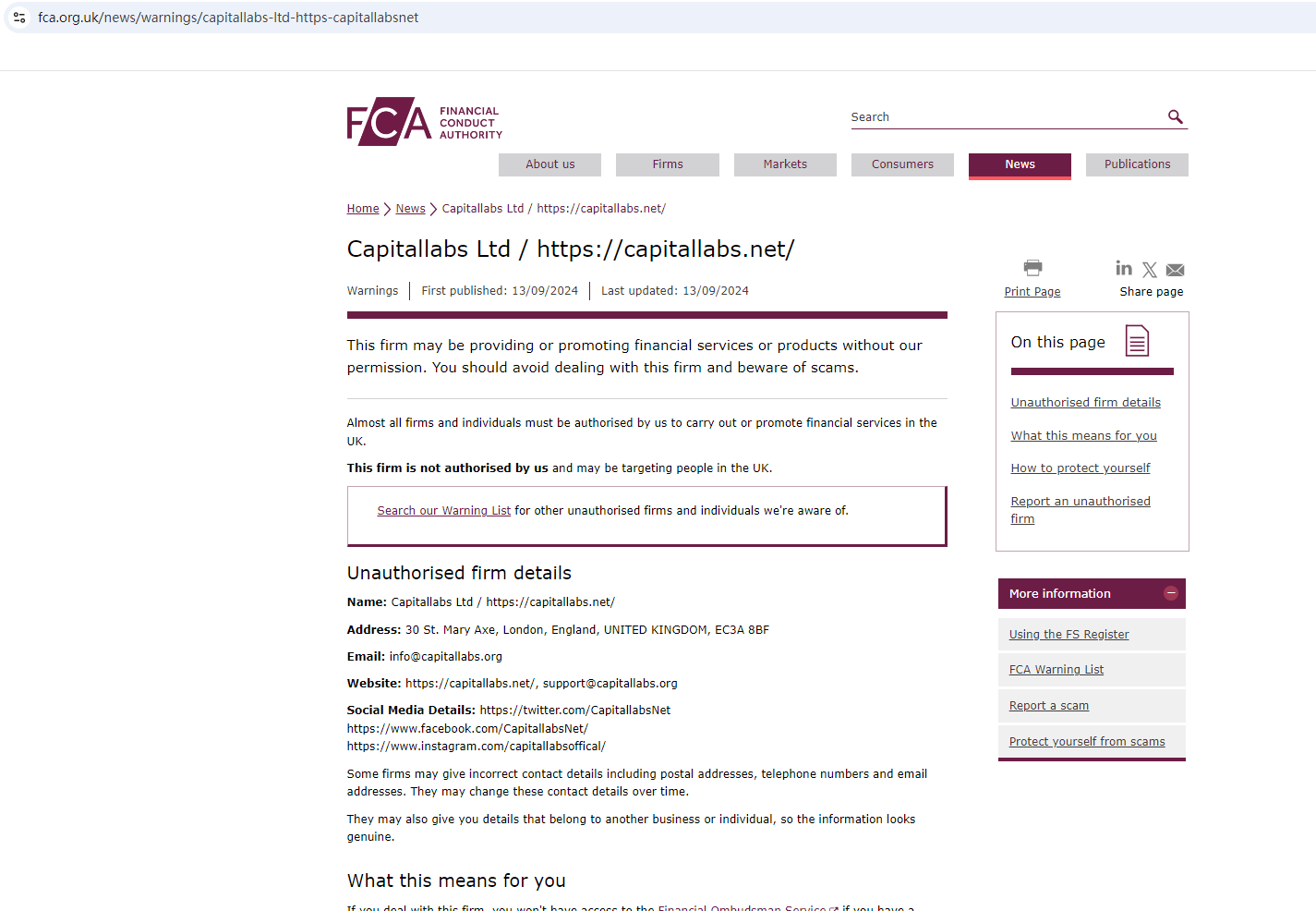 However, the UK's Financial Conduct Authority (FCA) has warned about Capitallabs Ltd, identifying it as an unauthorized firm and alerting investors to the potential scam.