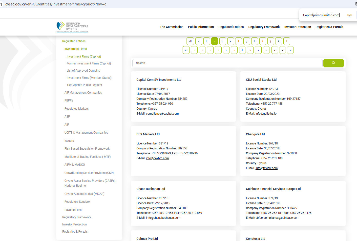 According to its website, it is regulated by both the Financial Conduct Authority (FCA) and the Cyprus Securities and Exchange Commission (CySEC). However, a search revealed no matching information with CySEC. Furthermore, the FCA issued a warning regarding Capitalprimeslimited.com, suspecting that this company may be offering financial services or products without the necessary authorization.