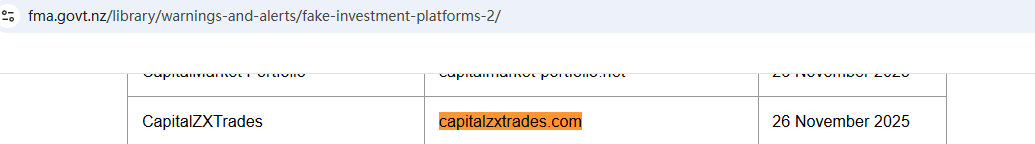 On Nov 26, 2025, the New Zealand Financial Markets Authority (NZ FMA) added CapitalZXTrades to its warning list, stating that this is a fake investment platform. https://www.fma.govt.nz/library/warnings-and-alerts/fake-investment-platforms-2/