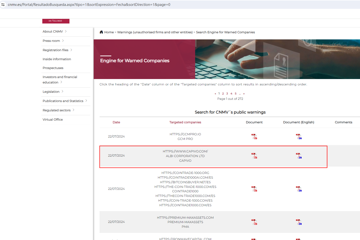 In addition, the Comisión Nacional del Mercado de Valores (CNMV) issued a warning that Capivo was providing financial services or products without authorisation.