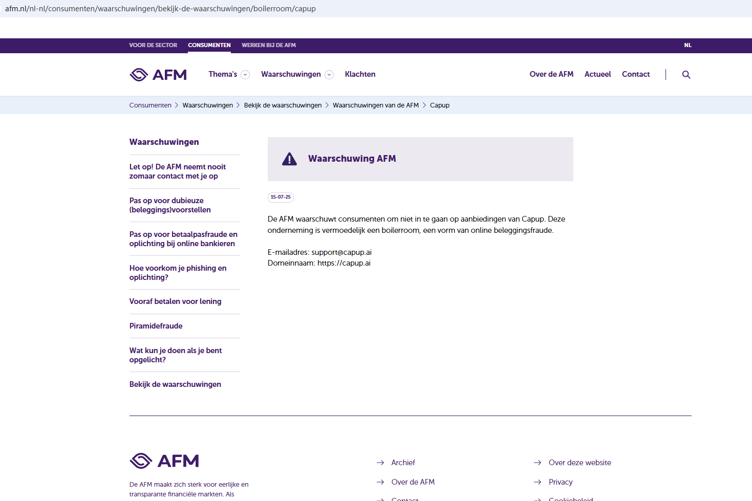 On July 15, 2025, the Netherlands Authority For the Financial Markets (AFM) issued a warning against Capup, believing this company might be providing financial services or products without proper authorization. https://www.afm.nl/nl-nl/consumenten/waarschuwingen/bekijk-de-waarschuwingen/boilerroom/capup