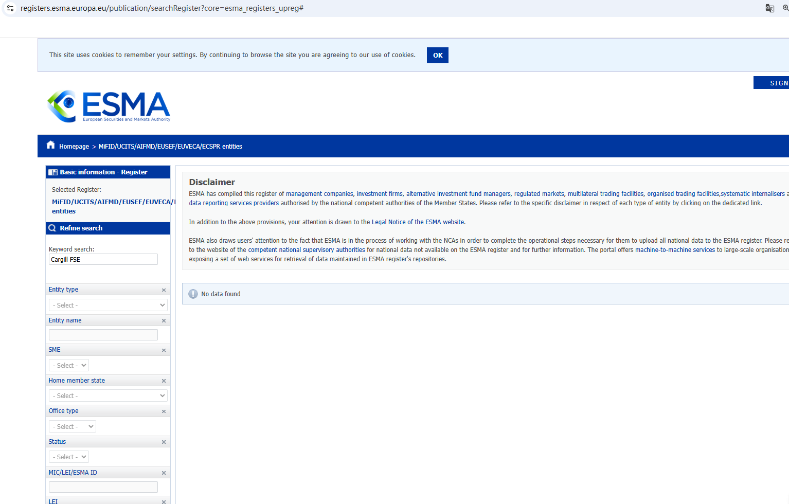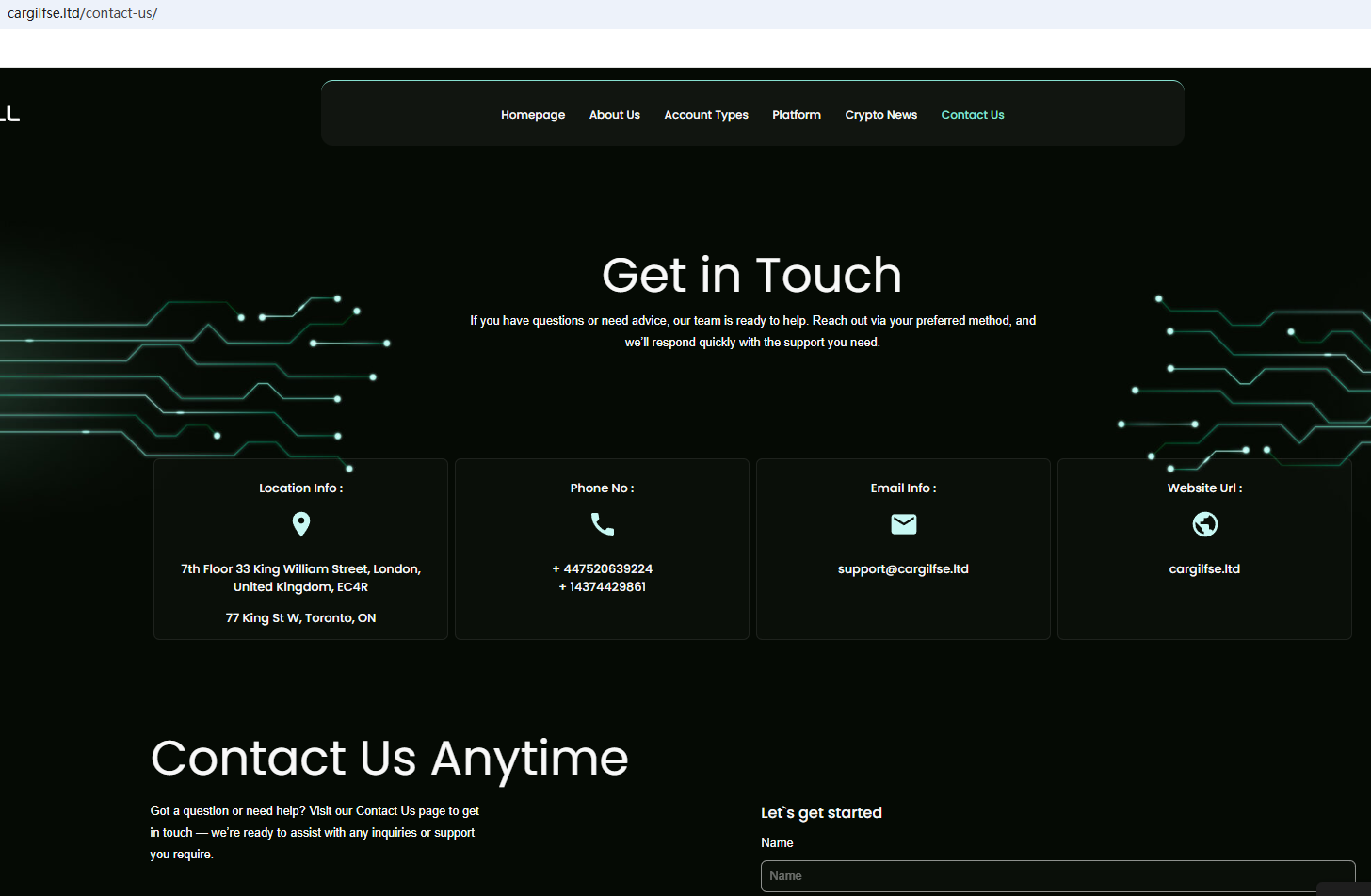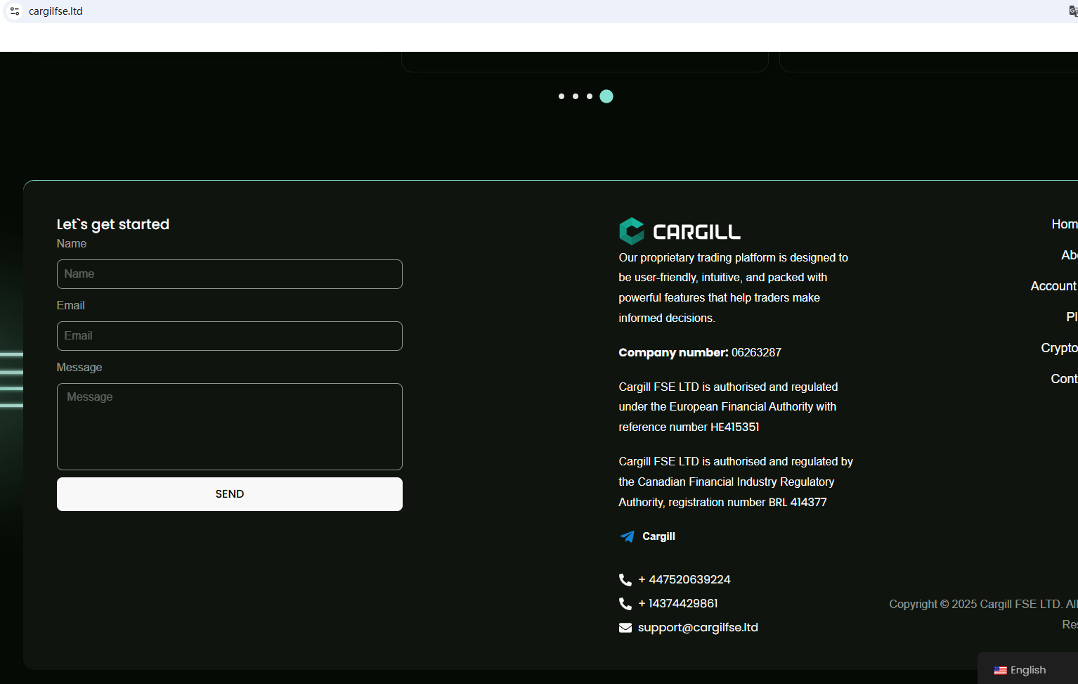 According to its website, it claims to be registered with multiple regulators. However, a search did not find any matching information with the European Securities and Markets Authority (ESMA) or Investment Industry Regulatory Organization of Canada (IIROC). In addition, the British Columbia Securities Commission (BCSC) issued a warning against Cargill FSE Ltd, stating that this broker is not registered to trade in, or advise on, securities or derivatives in BC.