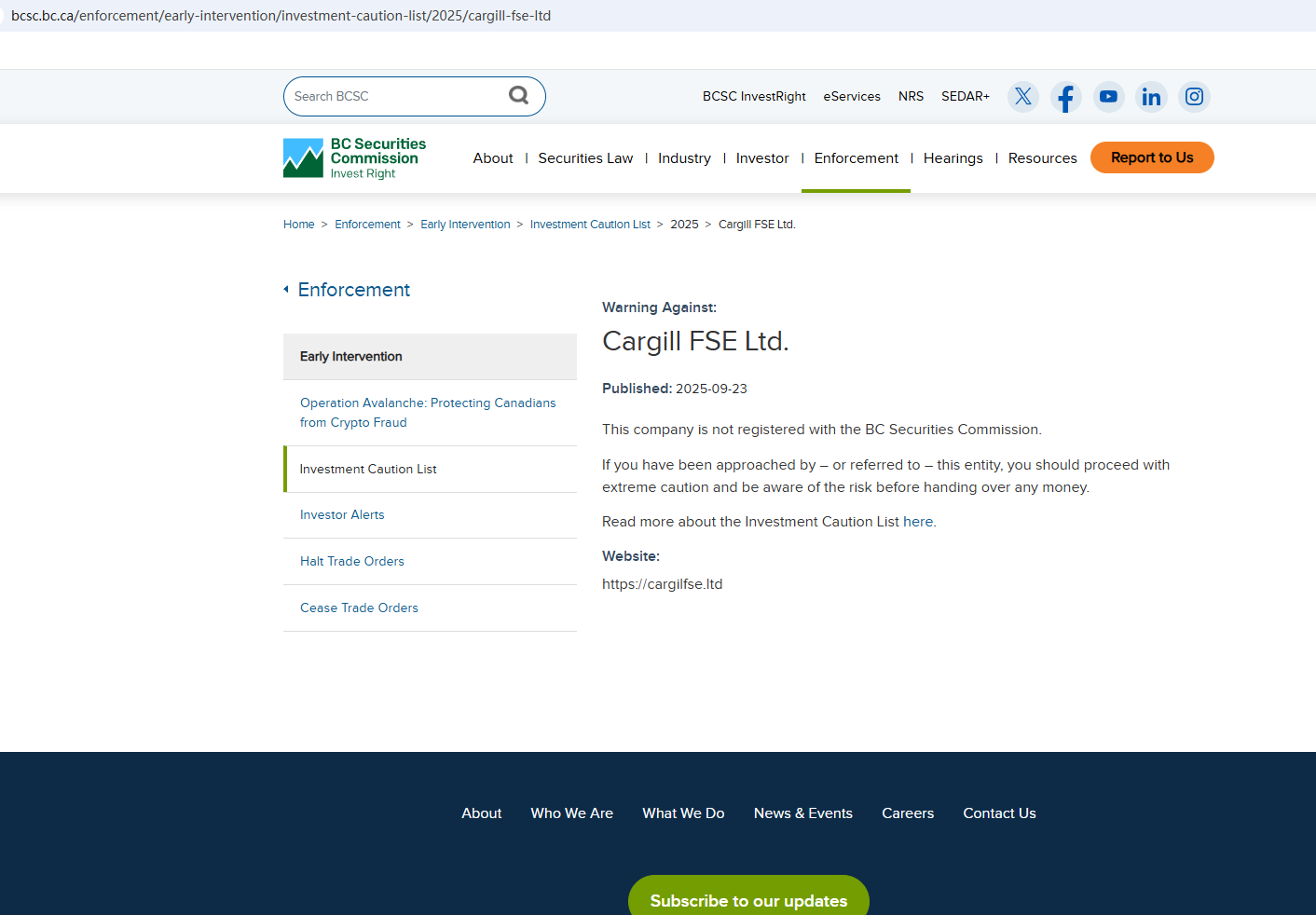 On Sept 23, 2025, the British Columbia Securities Commission (BCSC) issued a warning against Cargill FSE Ltd, stating that this broker is not registered to trade in, or advise on, securities or derivatives in BC. https://www.bcsc.bc.ca/enforcement/early-intervention/investment-caution-list/2025/cargill-fse-ltd