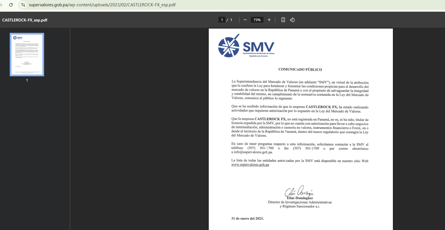 The website of Castle Rock FX has been disabled. The claimed registration with the Financial Services Authority of St. Vincent and the Grenadines (SVG FSA) has been canceled either. More concerning, we found that the La Superintendencia del Mercado de Valores (SMV) has issued a warning against Castle Rock FX for operating without the required authorization.